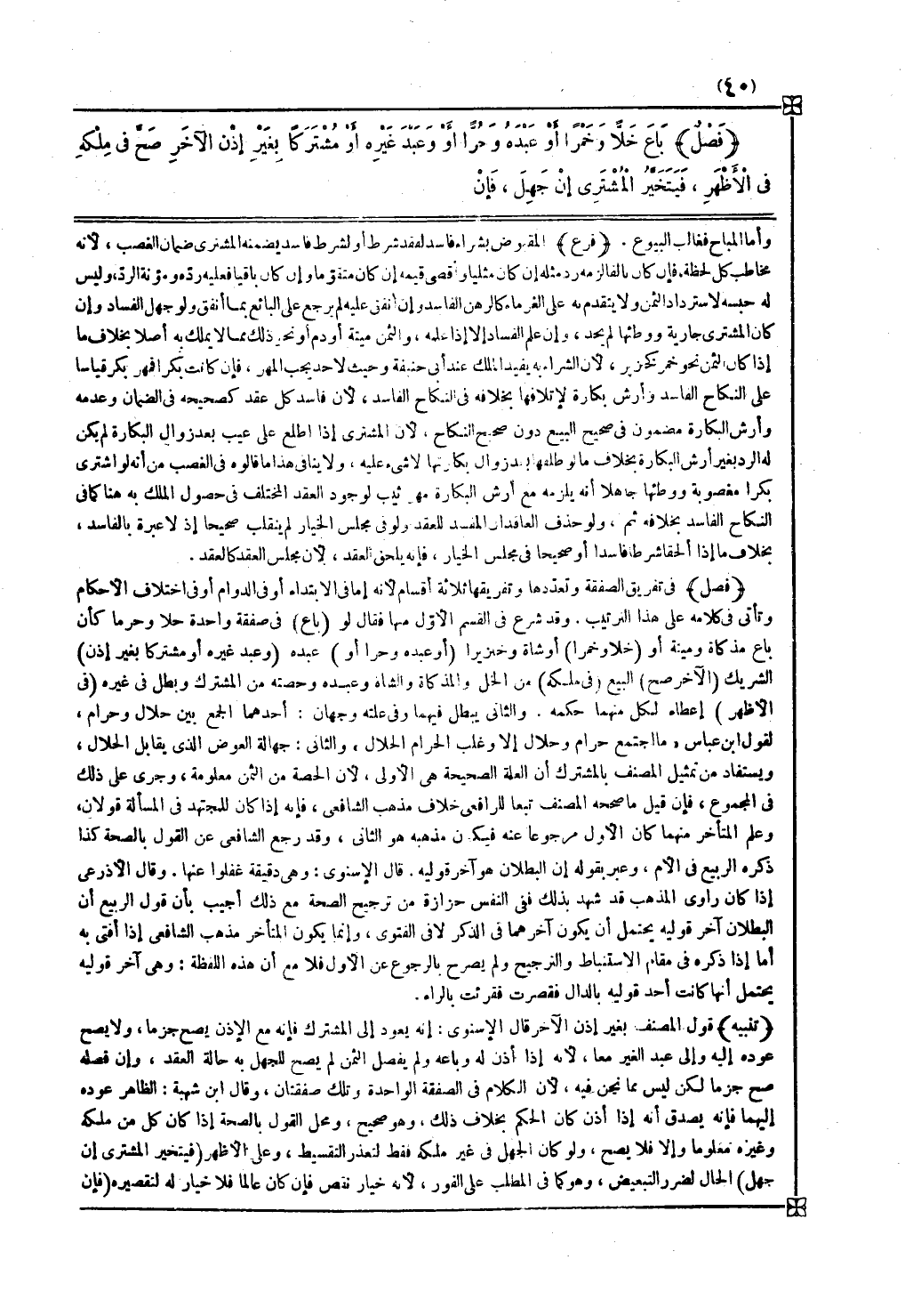 تنبيه قول المصنف بغير إذن الآخر قال الإسنوي إنه يعود إلى المشترك فإنه مع الإذن يصح جزما ولا يصح عوده إليه وإلى عبد الغير معا لأنه إذا أذن له وباعه ولم يفصل الثمن لم يصح للجهل به حالة العقد وإن فصله صح جزما لكن ليس مما نحن فيه لأن الكلام في الصفقة الواحدة وتلك صفقتان
