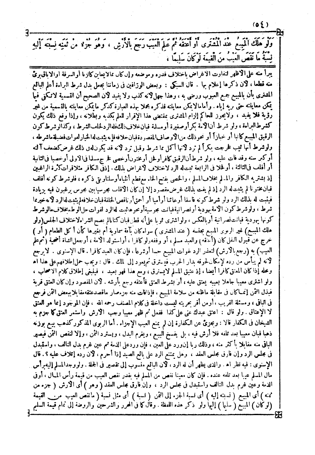 قال السبكي وبعض الوراقين في زماننا يجعل بدل شرط البراءة إعلام البائع المشتري بأن بالمبيع جميع العيوب ورضي به وهذا جهل لأنه كذب ولا يفيد لأن الصحيح أن التسمية لا تكفي فيما يمكن معاينته حتى يريه إياه