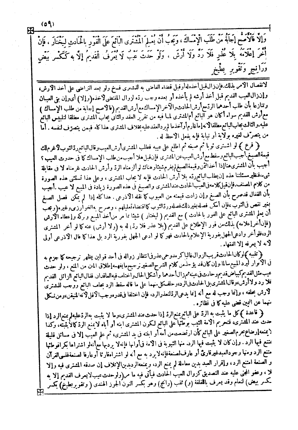 قاعدة كل ما يثبت به الرد على البائع يمنع الرد إذا حدث عند المشتري وما لا يثبت به الرد عليه لم يمنع الرد إذا حدث عندالمشتري فتحريم الأمة الثيب بوطئها على البائع لكون المشتري إبنه أو أباه لا يمنع الرد كما لا يثبته وكذا لا يمنعه إرضاع بحرم الصغير على البائع كأن ارتضعت من أمه أو إبنته في يد المشتري ثم علم الغيب إلا في مسائل قليلة يمتنع فيها الرد وإن كانت لا يثبت فيها الرد منها الثيوبة في الأمة في أوانها فإنه لا يرد بها مع أنه لو اشتراها بكرا فوطئها امتنع الرد