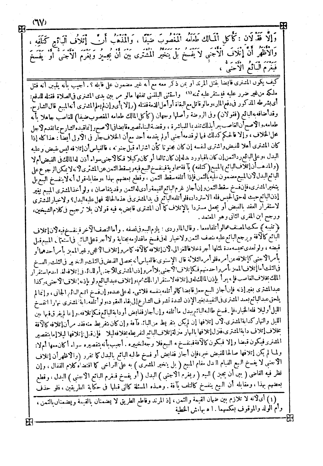 وإنما لم يلحق عبد البائع بعبد المشتري في التقييد بغير الإذن لشدة تشوف الشارع إلى بقاء العقود ولو أتلفه دابة المشتري نهارا انفسخ الليل أو ليلا فله الخيار فإن فسخ طالبه البائع ببدل ما أتلفه وإن أجاز فقابض أو دابة البائع فكإتلافه