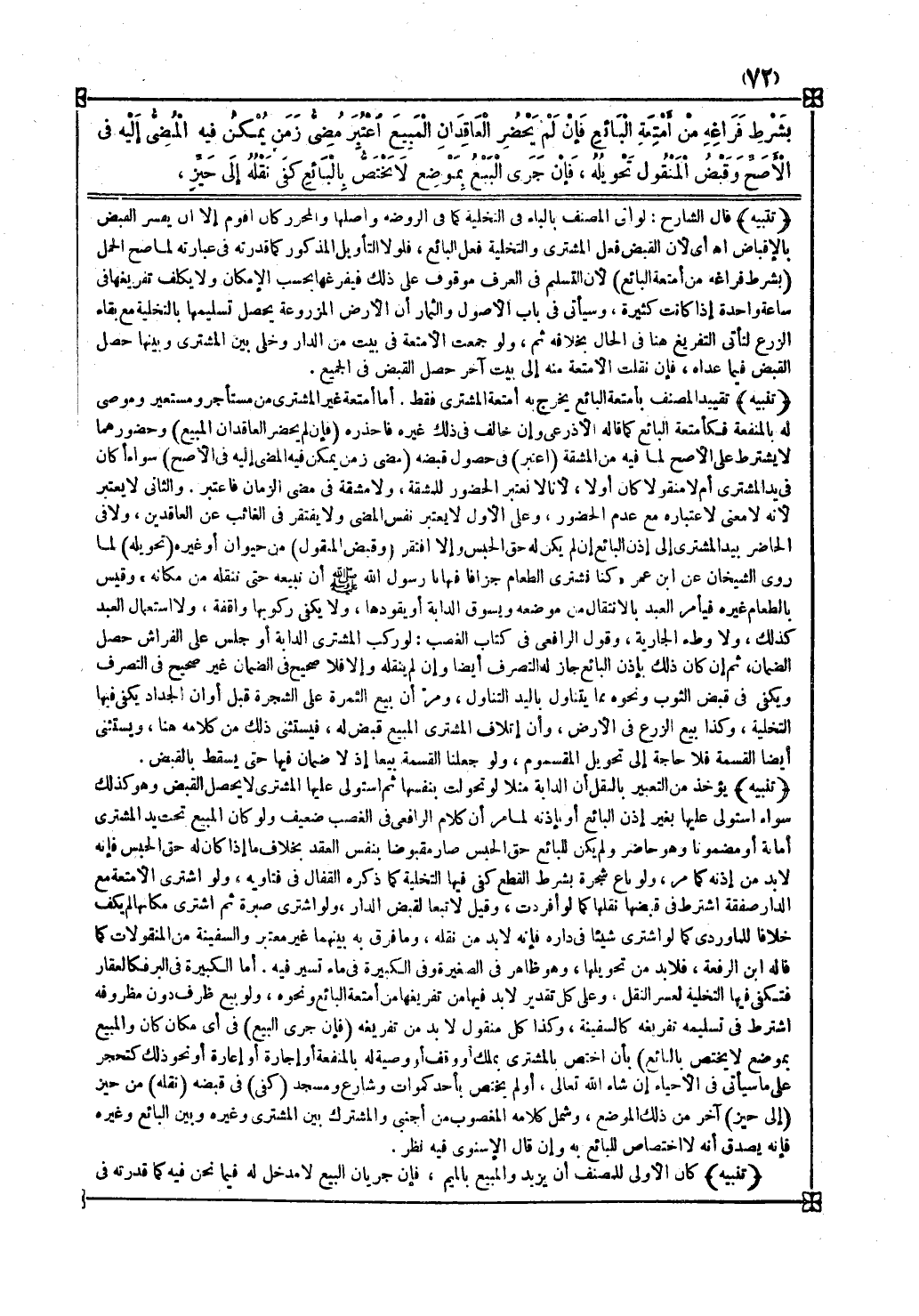 ( وقبض المنقول ) من حيوان أو غيره ( تحويله ) لما روى الشيخان عن ابن عمر كنا نشتري الطعام جزافا فنهانا رسول الله صلى الله عليه وسلم أن نبيعه حتى ننقله من مكانه