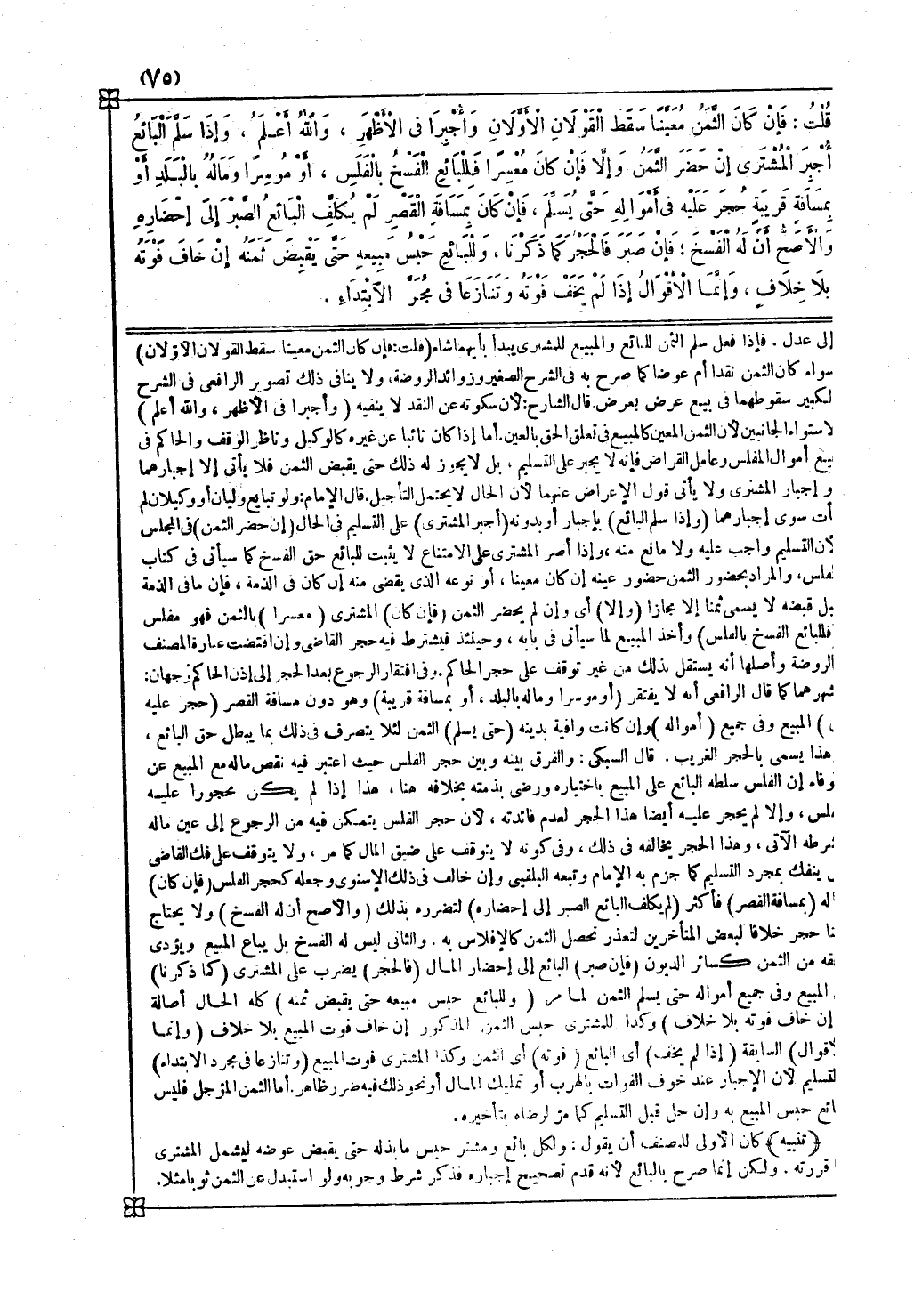 وهذا يسمى بالحجر الغريب قال السبكي والفرق بينه وبين حجر الفلس حيث اعتبر فيه نقص ما له مع المبيع عن الوفاء أن الفلس سلطه البائع على المبيع باختياره رضي بذمته بخلافه هنا هذا إذا لم يكن محجورا عليه بفلس وإلا لم يحجر عليه أيضا هذا الحجر لعدم فائدته لأن حجر الفلس يتمكن فيه من الرجوع إلى عين ماله بشرطه الآتي وهذا الحجر يخالفه في ذلك وفي كونه لا يتوقف على ضيق المال كما مر ولا يتوقف على فك القاضي بل ينفك بمجرد التسليم كما جزم به الإمام وتبعه البلقيني وإن خالف في ذلك الإسنوي وجعله كحجر الفلس