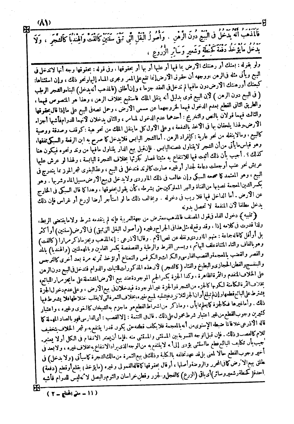 والثمرة الظاهرة وكذا الجزة بكسرة الجيم الموجودة عند بيع الأرض المشتملة على ما يجز مرارا للبائع بخلاف الثمرة الكامنة لكونها كالجزء من الشجرة والجزة غير الموجودة فيدخلان في بيع الأرض وعلى عدم دخول الجزة يشترط على البائع قطعها وإن لم تبلغ أوان الجز لئلا تزيد فيشتبه المبيع بغيره بخلاف الثمرة التي لا يغلب اختلاطها فلا يشترط فيها ذلك وأما غيرها فكالجزة كما يعلم مما يأتي