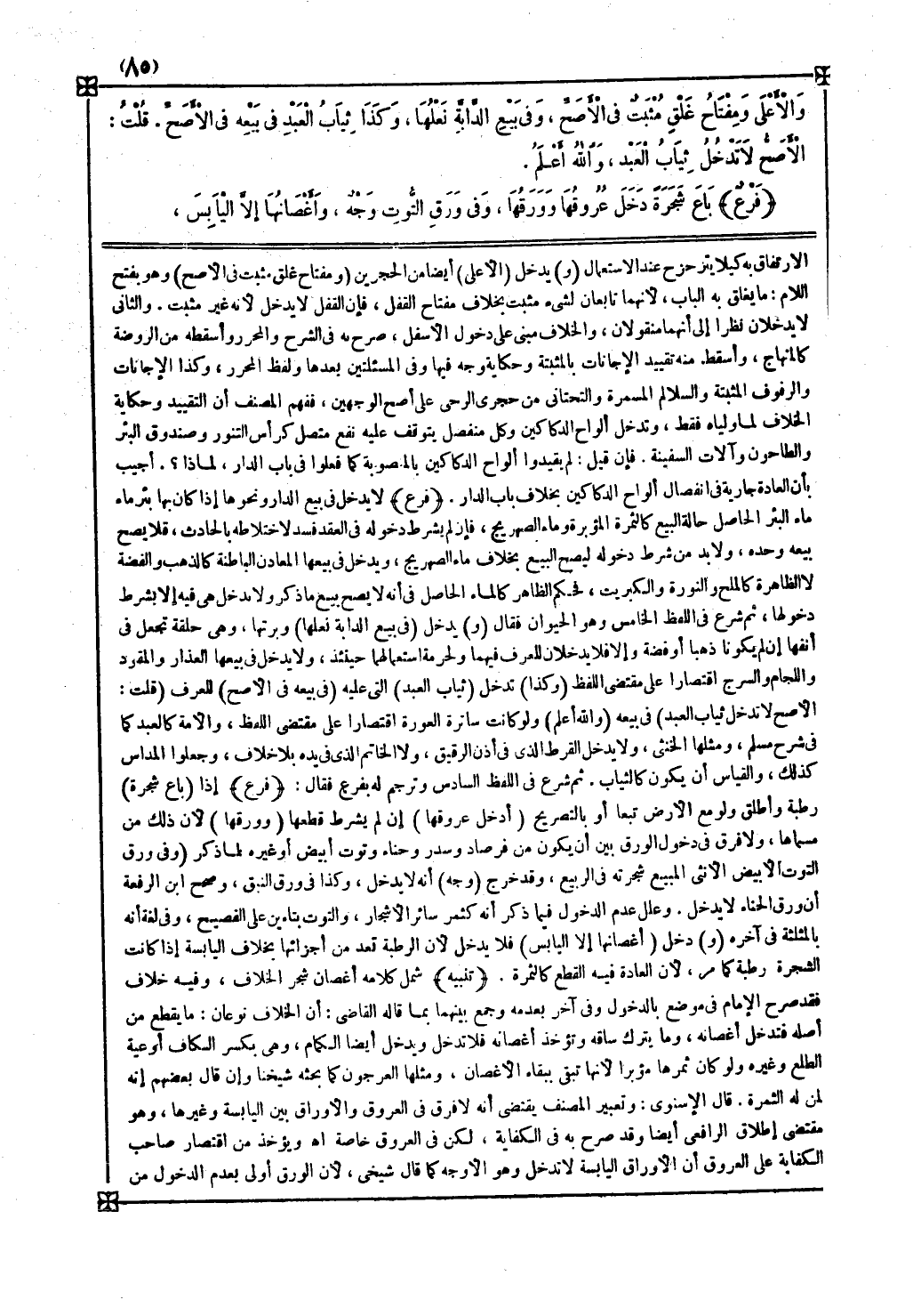 ثم شرع في اللفظ السادس وترجم له بفرع فقال فرع إذا ( باع شجرة ) رطبة وأطلق ولو مع الأرض تبعا أو بالتصريح ( أدخل عروقها ) إن لم يشرط قطعها ( وورقها ) لأن ذلك من مسماها ولا فرق في دخول الورق بين أن يكون من فرصاد وسدر وحناء وتوت أبيض أو غيره لما ذكر