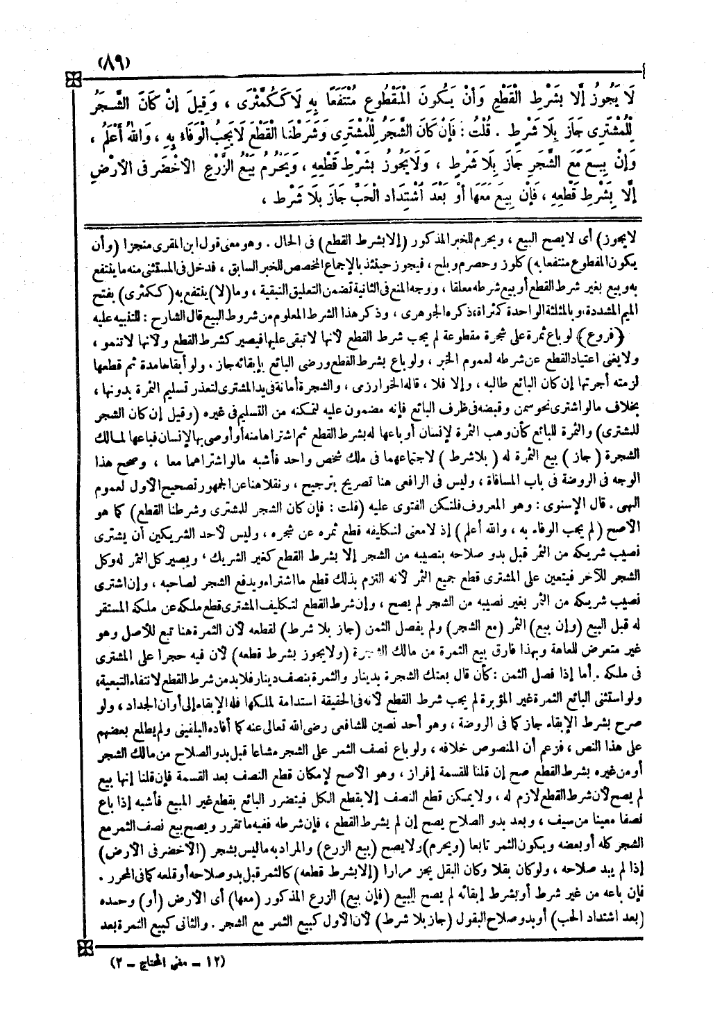 وليس لأحد الشريكين أن يشتري نصيب شريكه من الثمر قبل بدو صلاحه بنصيبه من الشجر إلا بشرط القطع كغير الشريك ويصير كل الثمر له وكل الشجر للآخر فيتعين على المشتري قطع جميع الثمر لأنه التزم بذلك قطع ما اشتراه ويدفع الشجر لصاحبه