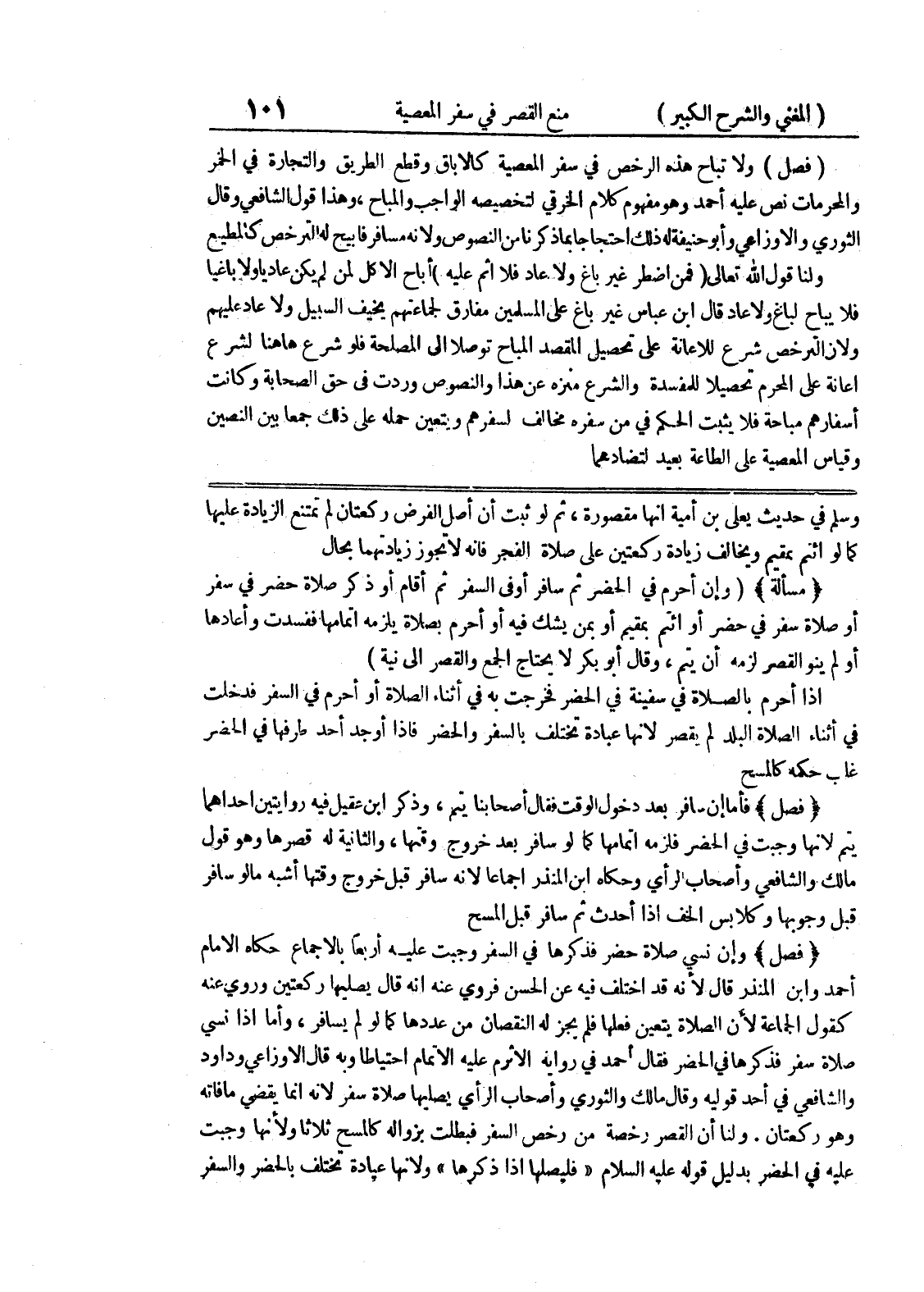 وسلم في حديث يعلى بن أمية أنها مقصورة، ثم لو ثبت أن أصل الفرض ركعتان لم تمتنع الزيادة عليها كما لو ائتم بمقيم ويخالف زيادة ركعتين على صلاة الفجر فإنه لا تجوز زيادتهما بحال * (مسألة) * (وإن أحرم في الحضر ثم سافر أو في السفر ثم أقام أو ذكر صلاة حضر في سفر أو صلاة سفر في حضر أو ائتم بمقيم أو بمن يشك فيه أو أحرم بصلاة يلزمه اتمامها ففسدت وأعادها أو لم القصر لزمه أن يتم، وقال أبو بكر لا يحتاج الجمع والقصر الى نية) اذا أحرم بالصلاة في سفينة في الحضر فخرجت به في أثناء الصلاة أو أحرم في السفر فدخلت في أثناء الصلاة البلد لم يقصر لأنها عبادة تختلف بالسفر والحضر فاذا أوجد أحد طرفها في الحضر غلب حكمه كالمسح * (فصل) * فأما إن سافر بعد دخول الوقت فقال أصحابنا يتم، وذكر ابن عقيل فيه روايتين إحداهما يتم لأنها وجبت في الحضر فلزمه إتمامها كما لو سافر بعد خروج وقتها، والثانية له قصرها وهو قول