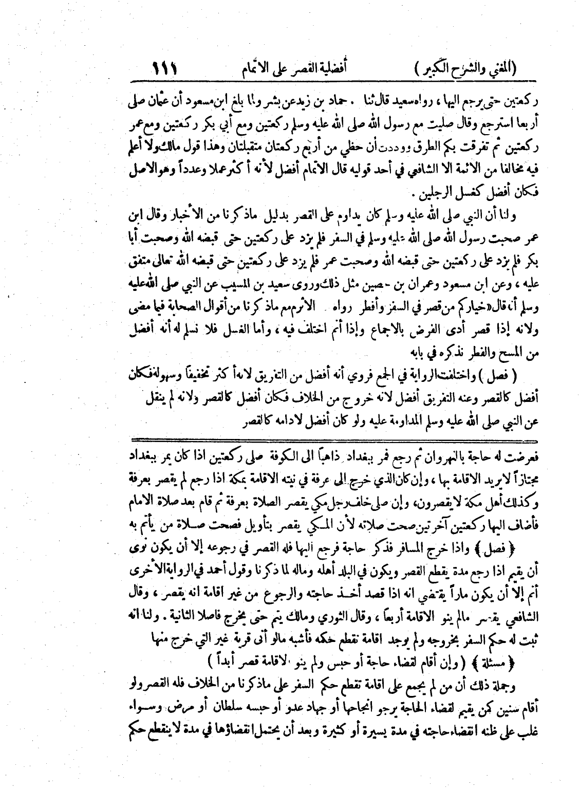 فعرضت له حاجة بالنهروان ثم رجع فمر ببغداد ذاهباً الى الكوفة صلى ركعتين اذا كان يمر ببغداد مجتازاً لا يريد الاقامة بها، وإن كان الذي خرج الى عرفة في نيته الإقامة بمكة إذا رجع لم يقصر بعرفة وكذلك أهل مكة لا يقصرون، وإن صلى خلف رجل مكي يقصر الصلاة بعرفة ثم قام بعد صلاة الامام فأضاف اليها ركعتين آخرتين صحت صلاته لانه المكي يقصر بتأويل فصحت صلاة من يأتم به * (فصل) * وإذا خرج المسافر فذكر حاجة فرجع اليها فله القصر في رجوعه إلا أن يكون نوى أن يقيم اذا رجع مدة يقطع القصر ويكون في البلد أهله وماله لما ذكرنا وقول أحمد في الرواية الأخرى أتم إلا أن يكون ماراً يقتضي أنه إذا قصد أخذ حاجته والرجوع من غير إقامة أنه يقصر، وقال الشافعي يقصر ما لم ينو الاقامة أربعاً، وقال الثوري ومالك يتم حتى يخرج فاصلاً الثانية.