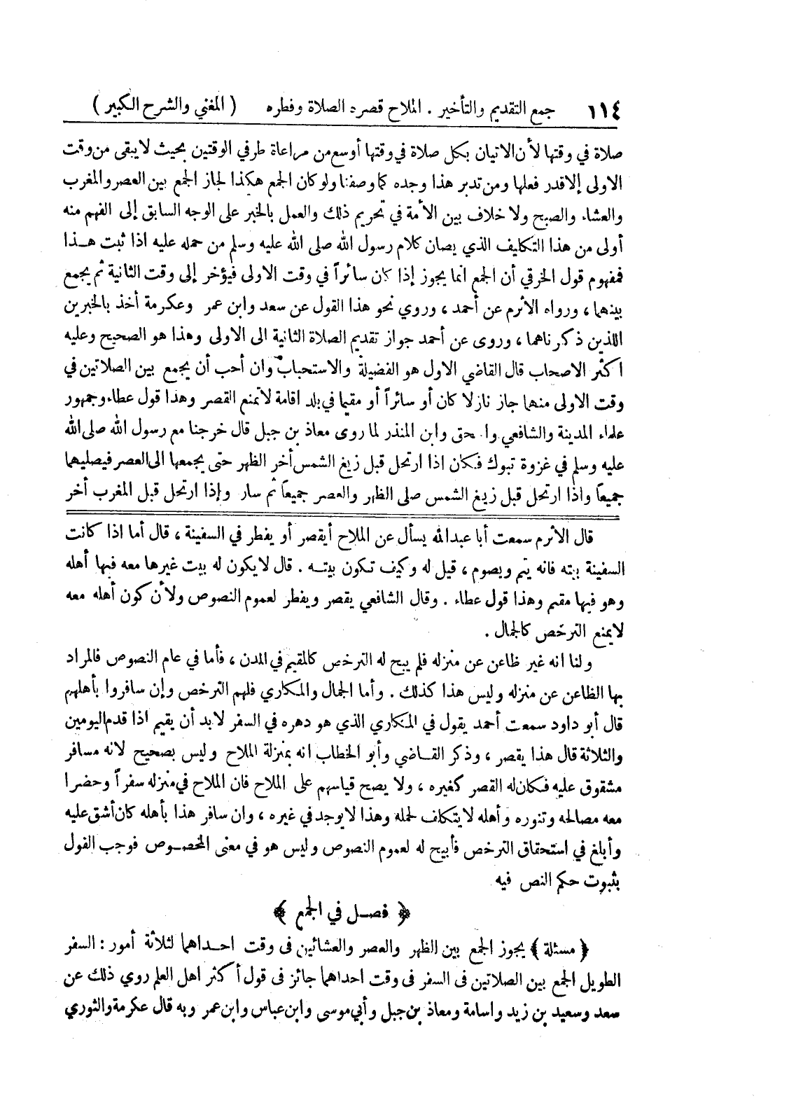 وأما الجمال والمكاري فلهم الترخص وإن سافروا بأهلهم قال أبو داود سمعت أحمد يقول في المكاري الذي هو دهره في السفر لابد أن يقيم اذا قدم اليومين والثلاثة قال هذا يقصر، وذكر القاضي وابو الخطاب أنه بمنزلة الملاح وليس بصحيح لأنه مسافر مشقوش عليه فكان له القصر كغيره، ولا يصح قياسهم على الملاح فان الملاح في منزله سفراً وحضراً معه مصالحه وتنوره وأهله لا يتكلف لحمله وهذا لا يوجد في غيره، وإن سافر هذا بأهله كان أشق عليه وأبلغ في استحقاق الترخص فأبيح له لعموم النصوص وليس هو في معنى المخصوص فوجب القول بثبوت حكم النص فيه * (فصل في الجمع) * * (مسألة) * يجوز الجمع بين الظهر والعصر والعشائين في وقت إحداهما لثلاثة أمور: السفر الطويل الجمع بين الصلاتين في السفر في وقت إحداهما جائز في قول أكثر أهل العلم روي ذلك عن سعد وسعيد بن زيد وأسامة ومعاذ بن جبل وأبي موسى وابن عباس وابن عمر وبه قال عكرمة والثوري