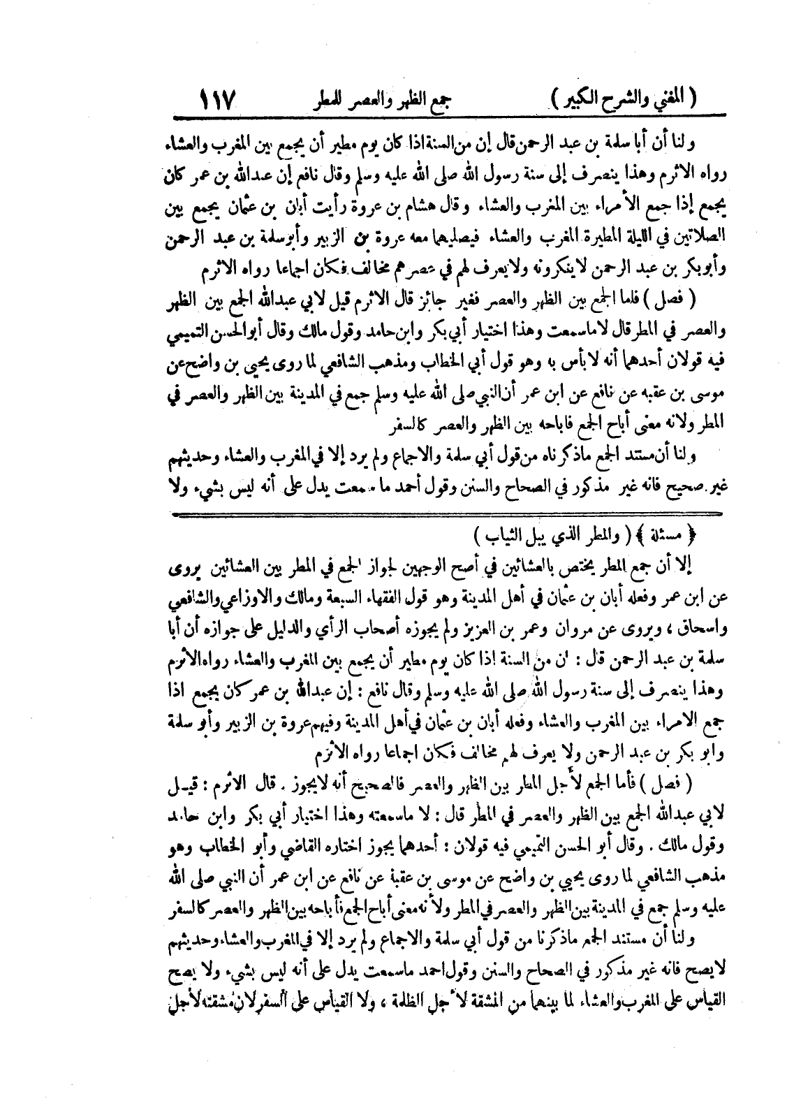* (مسألة) * (والمطر الذي يبل الثياب) إلا أن جمع المطر يختص بالعشائين في أصح الوجهين لجواز الجمع في المطر بين العشائين يروي عن ابن عمر وفعله أبان بن عثمان في أهل المدينة وهو قول الفقهاء السبعة ومالك والاوزاعي والشافعي واسحاق، ويروى عن مروان وعمر بن العزيز ولم يجوزه أصحاب الرأي والدليل على جوازه أن أبا سلمة بن عبد الرحمن قال: إن من السنة إذا كان يوم مطير أن يجمع بين المغرب والعشاء رواه الأثرم وهذا ينصرف إلى سنة رسول الله صلى الله عليه وسلم وقال نافع: أن عبد الله بن عمر كان يجمع اذا جمع الامراء بين المغرب والعشاء وفعله أبان بن عثمان في أهل المدينة وفيهم عروة بن الزبير وأبو سلمة وأبو بكر بن عبد الرحمن ولا يعرف لهم مخالف فكان إجماعا رواه الأثرم