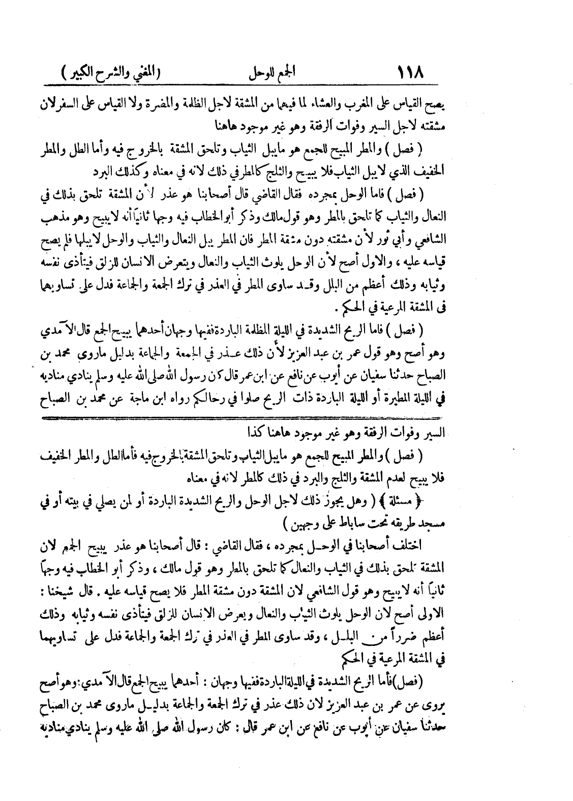 السير وفوات الرفقة وهو غير موجود ها هنا كذا (فصل) والمطر المبيح للجمع هو ما يبل الثياب وتلحق المشقة بالخروج فيه فأما الطل والمطر الخفيف فلا يبيح لعدم المشقة والثلج والبرد في ذلك كالمطر لأنه في معناه * (مسألة) * (وهل يجوز ذلك لأجل الوحل والريح الشديدة الباردة أو لمن يصلي في بيته أو في مسجد طريقه تحت ساباط على وجهين) اختلف أصحابنا في الوحل بمجرده، فقال القاضي: قال أصحابنا هو عذر يبيح الجمع لأن المشقة تلحق بذلك في الثياب والنعال كما تلحق بالمطر وهو قول مالك، وذكر أبو الخطاب فيه وجهاً ثانياً أنه لا يبيح وهو قول الشافعي لأن المشقة دون مشقة المطر فلا يصح قياسه عليه.