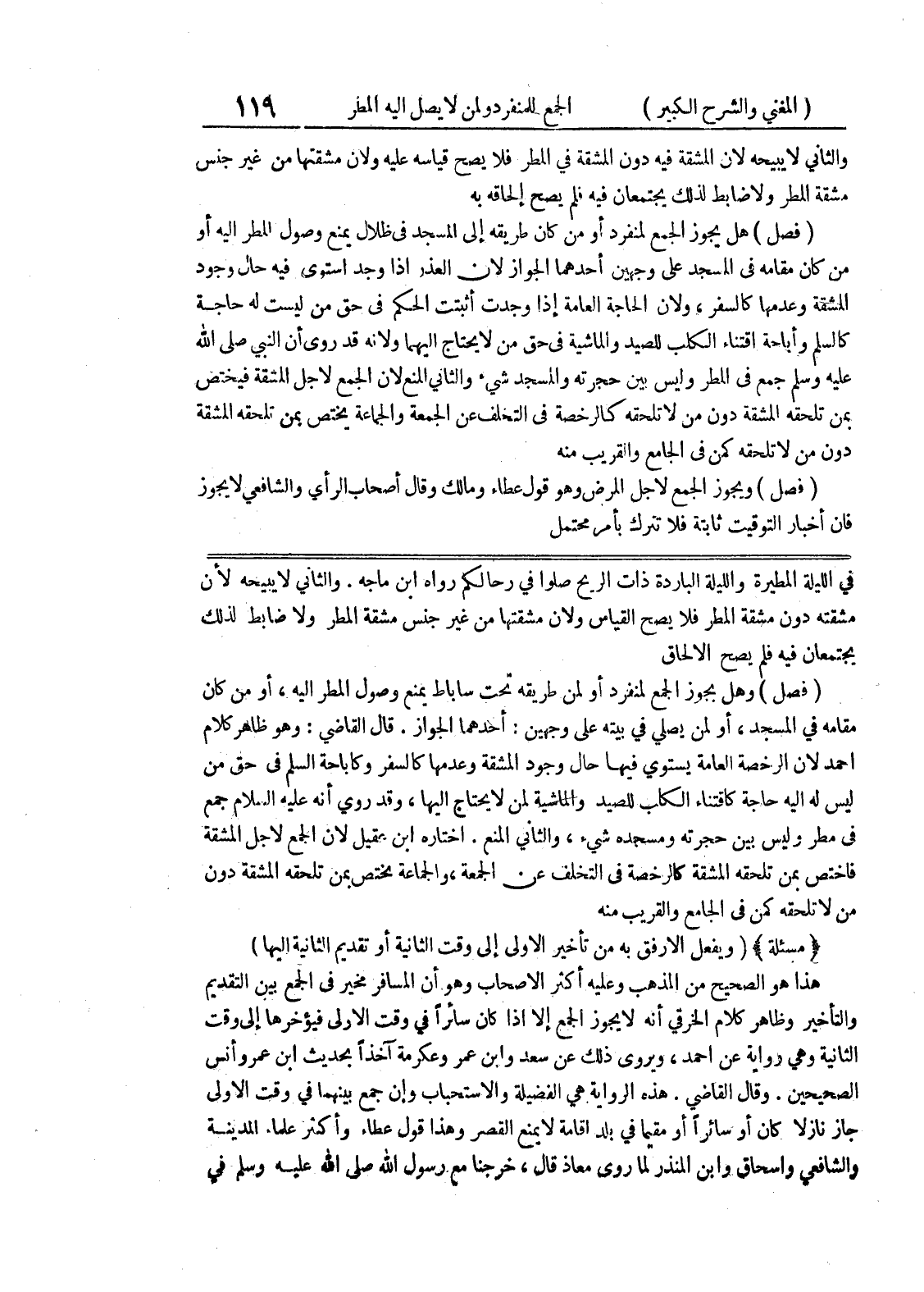 والثاني لا يبيحه لأن مشقته دون مشقة المطر فلا يصح القياس ولأن مشقتها من غير جنس مشقة المطر ولا ضابط لذلك يجتمعان فيه فلم يصح الإلحاق (فصل) وهل بجوز الجمع لمنفرد أو لمن طريقه تحت ساباط يمنع وصول المطر إليه، أو من كان مقامه في المسجد، أو لمن يصلي في بيته على وجهين: أحدهما الجواز.