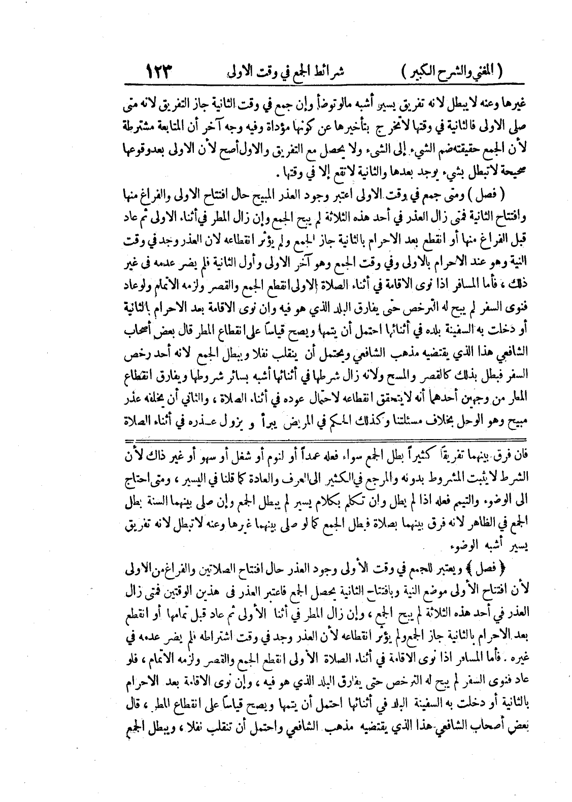 فإن فرق بينهما تفريقاً كثيراً بطل الجمع سواء فعله عمداً أو لنوم أو شغل أو سهو أو غير ذلك لأن الشرط لا يثبت المشروط بدونه والمرجع في الكثير إلى العرف والعادة كما قلنا في اليسير، ومتى احتاج الى الوضوء والتيمم فعله إذا لم يطل وان تكلم بكلام يسير لم يبطل الجمع وإن صلى بينهما السنة بطل الجمع في الظاهر لأنه فرق بينهما بصلاة فبطل الجمع كما لو صلى بينهما غيرها وعنه لا تبطل لأنه تفريق يسير أشبه الوضوء * (فصل) * ويعتبر للجمع في وقت الأولى وجود العذر حال افتتاح الصلاتين والفراغ من الاولى