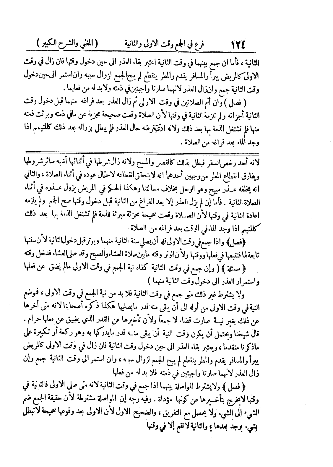 فأما إن لم يزل العذر إلا بعد الفراغ من الثانية قبل دخول وقتها صح الجمع ولم يلزمه اعادة الثانية في وقتها لأن الصلاة وقعت صحيحة مجزئة مبرئة للذمة فلم تشتغل الذمة بها بعد ذلك كالمتيمم إذا وجد الماء في الوقت بعد فراغه من الصلاة * (فصل) * وإذا جمع في وقت الأولى فله أن يصلي سنة الثانية منهما ويوتر قبل دخول الثانية لأن سنتها تابعة لها فتتبعها في فعلها ووقتها ولأن الوتر وقته ما بين صلاة العشاء والصبح وقد صلى العشاء فدخل وقته * (مسألة) * (وإن جمع في وقت الثانية كفاه نية الجمع في وقت الأولى ما لم يضق عن فعلها واستمرار العذر الى دخول وقت الثانية منهما) ولا يشترط غير ذلك متى جمع في وقت الثانية فلا بد من نية الجمع في وقت الاولى، فموضع النية في وقت الأولى من أوله الى أن يبقى منه قدر ما يصليها هكذا ذكره أصحابنا لأنه متى أخرها عن ذلك بغير نية صارت قضاء لا جمعاً ولأن تأخيرها عن القدر الذي يضيق عن فعلها حرام.
