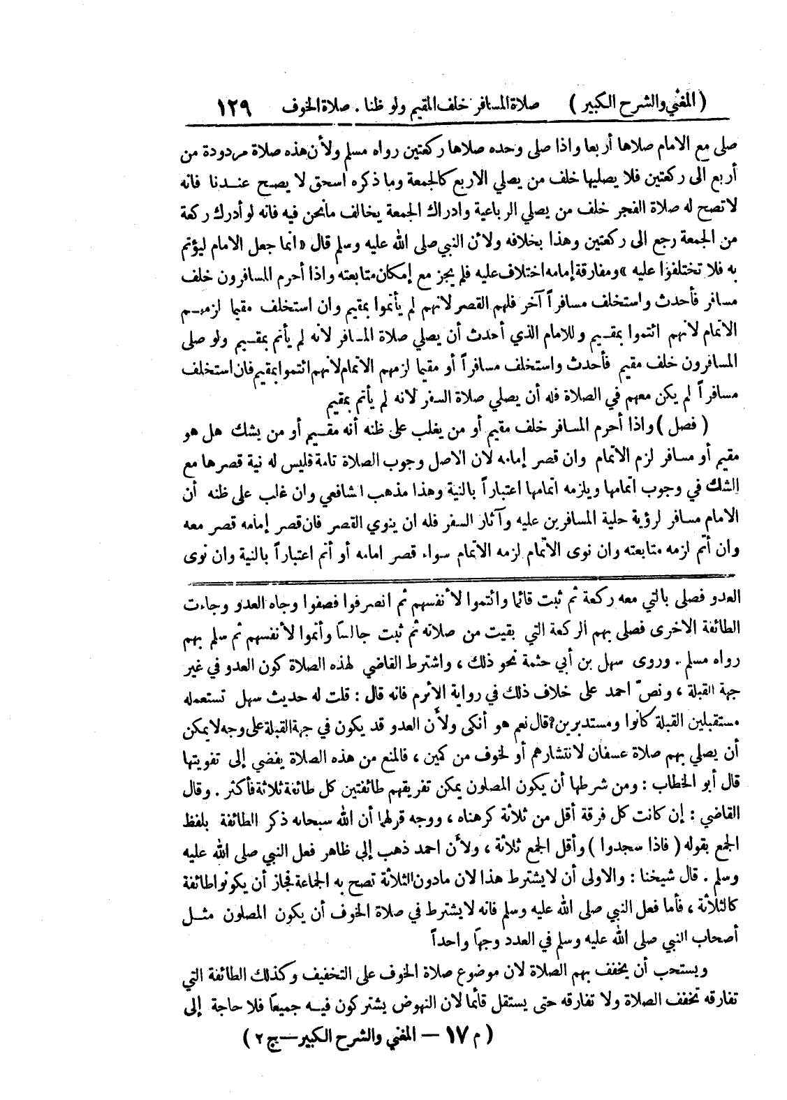 وروى سهل بن أبي حثمة نحو ذلك، واشترط القاضي لهذه الصلاة كون العدو في غير جهة القبلة، ونص أحمد على خلاف ذلك في رواية الأثرم فإنه قال: قلت له حديث سهل تستعمله مستقبلين القبلة كانوا ومستدبرين؟ قال نعم هو أنكى ولأن العدو قد يكون في جهة القبلة على وجه لا يمكن أن يصلي بهم صلاة عسفان لانتشارهم أو لخوف من كمين، فالمنع من هذه الصلاة يفضي إلى تفويتها قال أبو الخطاب: ومن شرطها أن يكون المصلون يمكن تفريقهم طائفتين كل طائفة ثلاثة فأكثر.