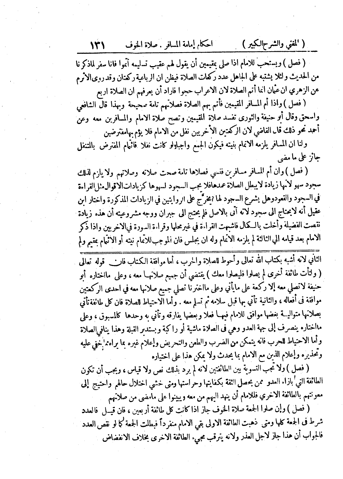 وأما الاحتياط للصلاة فان كل طائفة تأتي بصلاتها متوالية بغضها موافق للامام فيها فعلاً وبعضها يفارقه وتأتي به وحدها كالمسبوق، وعلى ما اختاره ينصرف إلى جهة العدو وهي في الصلاة ماشية أو راكبة ويستدبر القبلة وهذا ينافي الصلاة وأما الاحتياط للحرب فإنه يتمكن من الضرب والطعن والتحريض وإعلام غيره بما يراه مما خفي عليه وتحذيره وإعلام الذين مع الامام بما يحدث ولا يمكن هذا على اختياره (فصل) ولا تجب التسوية بين الطائفتين لأنه لم يرد بذلك نص ولا قياس، ويجب أن تكون الطائفة التي بازاء العدو ممن يحصل الثقة بكفايتها وحراستها ومتى خشي اختلال حالهم واحتيج إلى معونتهم بالطائفة الأخرى فللإمام أن ينهد إليهم من معه ويبينوا على ما مضى من صلاتهم