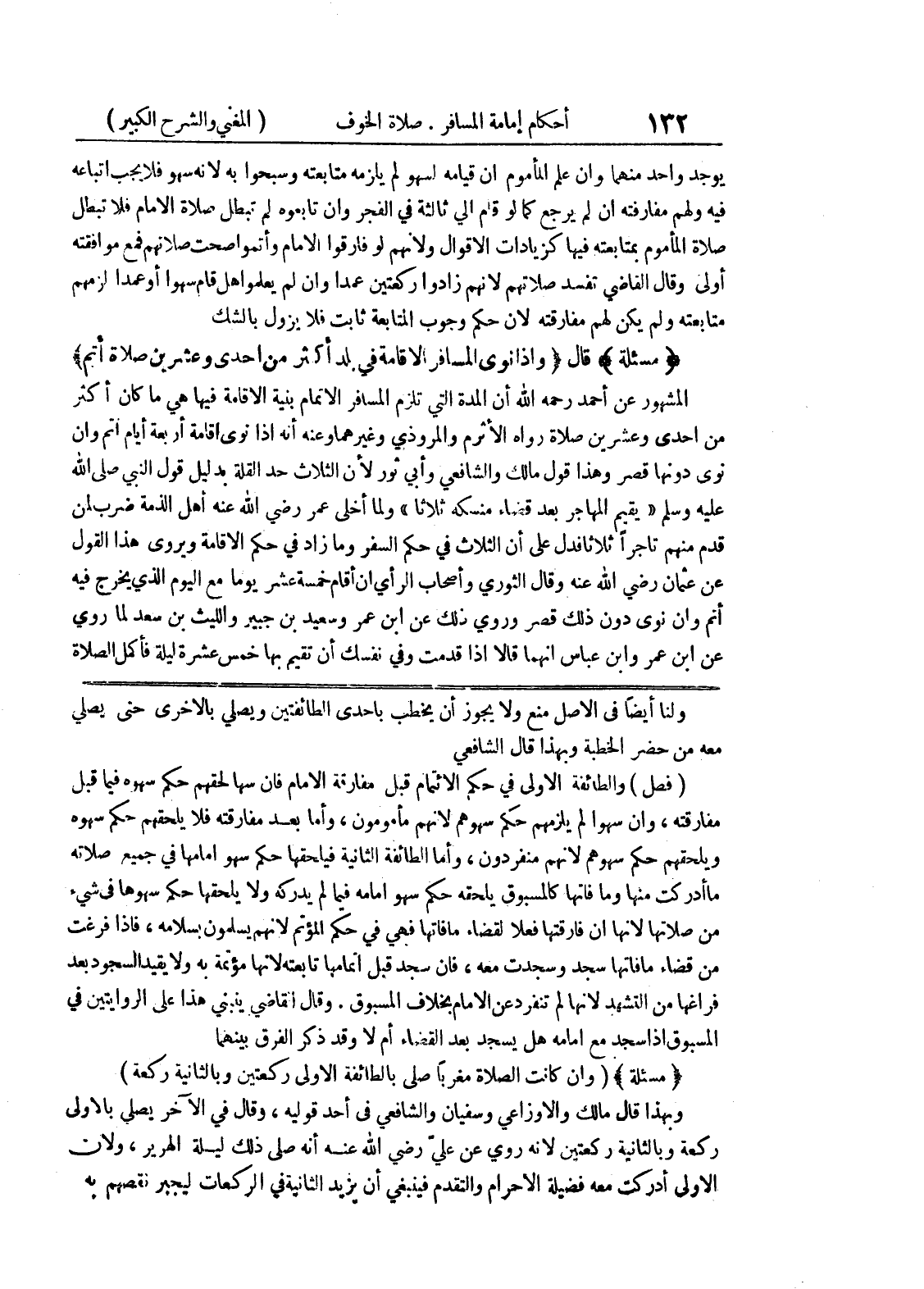 ولنا أيضاً في الأصل منع ولا يجوز أن يخطب بإحدى الطائفتين ويصلي بالأخرى حتى يصلي معه من حضر الخطبة وبهذا قال الشافعي (فصل) والطائفة الاولى في حكم الائتمام قبل مفارقة الامام فان سها لحقهم حكم سهوه فيما قبل مفارقته، وان سهوا لم يلزمهم حكم سهوهم لأنهم مأمومون، وأما بعد مفارقته فلا يلحقهم حكم سهوه ويلحقهم حكم سهوهم لأنهم منفردون، وأما الطائفة الثانية فيلحقها حكم سهو امامها في جميع صلاته ما أدركت منها وما فاتها كالمسبوق يلحقه حكم سهو امامه فيما لم يدركه ولا يلحقها حكم سهوها في شئ من صلاتها لأنها أن فارقتها فعلاً لقضاء ما فاتها فهي في حكم المؤتم لأنهم يسلمون بسلامه، فاذا فرغت من قضاء ما فاتها سجد وسجدت معه، فان سجد قبل إتمامها تابعته لأنها مؤتمة به ولا يقيد السجود بعد فراغها من التشهد لأنها لم تنفرد عن الامام بخلاف المسبوق.