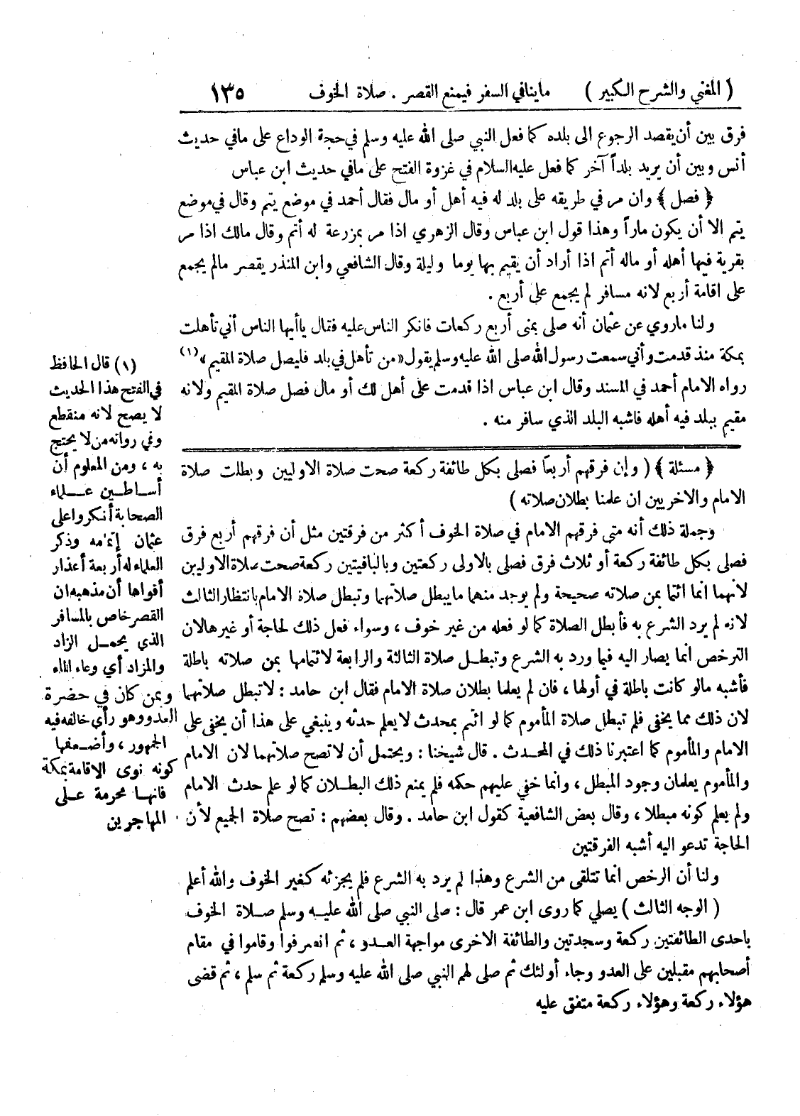 * (مسألة) * (وإن فرقهم أربعاً فصلى بكل طائفة ركعة صحت صلاة الاوليين وبطلت صلاة الامام والاخريين ان علمنا بطلان صلاته) وجملة ذلك أنه متى فرقهم الإمام في صلاة الخوف أكثر من فرقتين مثل أن فرقهم أربع فرق فصلى بكل طائفة ركعة أو ثلاث فرق فصلى بالاولى ركعتين وبالباقيتين ركعة صحت صلاة الاوليين لأنهما إنما ائتما بمن صلاته صحيحة ولم يوجد منهما ما يبطل صلاتهما وتبطل صلاة الامام بانتظار الثالث لأنه لم يرد الشرع به فأبطل الصلاة كما لو فعله من غير خوف، وسواء فعل ذلك لحاجة أو غيرها لأن الترخص انما يصار اليه فيما ورد به الشرع وتبطل صلاة الثالثة والرابعة لائتمامها بمن صلاته باطلة فأشبه ما لو كانت باطلة في أولها، فإن لم يعلما بطلان صلاة الامام فقال ابن حامد: لا تبطل صلاتهما لأن ذلك مما يخفى فلم تبطل صلاة المأموم كما لو ائتم بمحدث لا يعلم حدثه وينبغي على هذا أن يخفى على الامام والمأموم كما اعتبرنا ذلك في المحدث.
