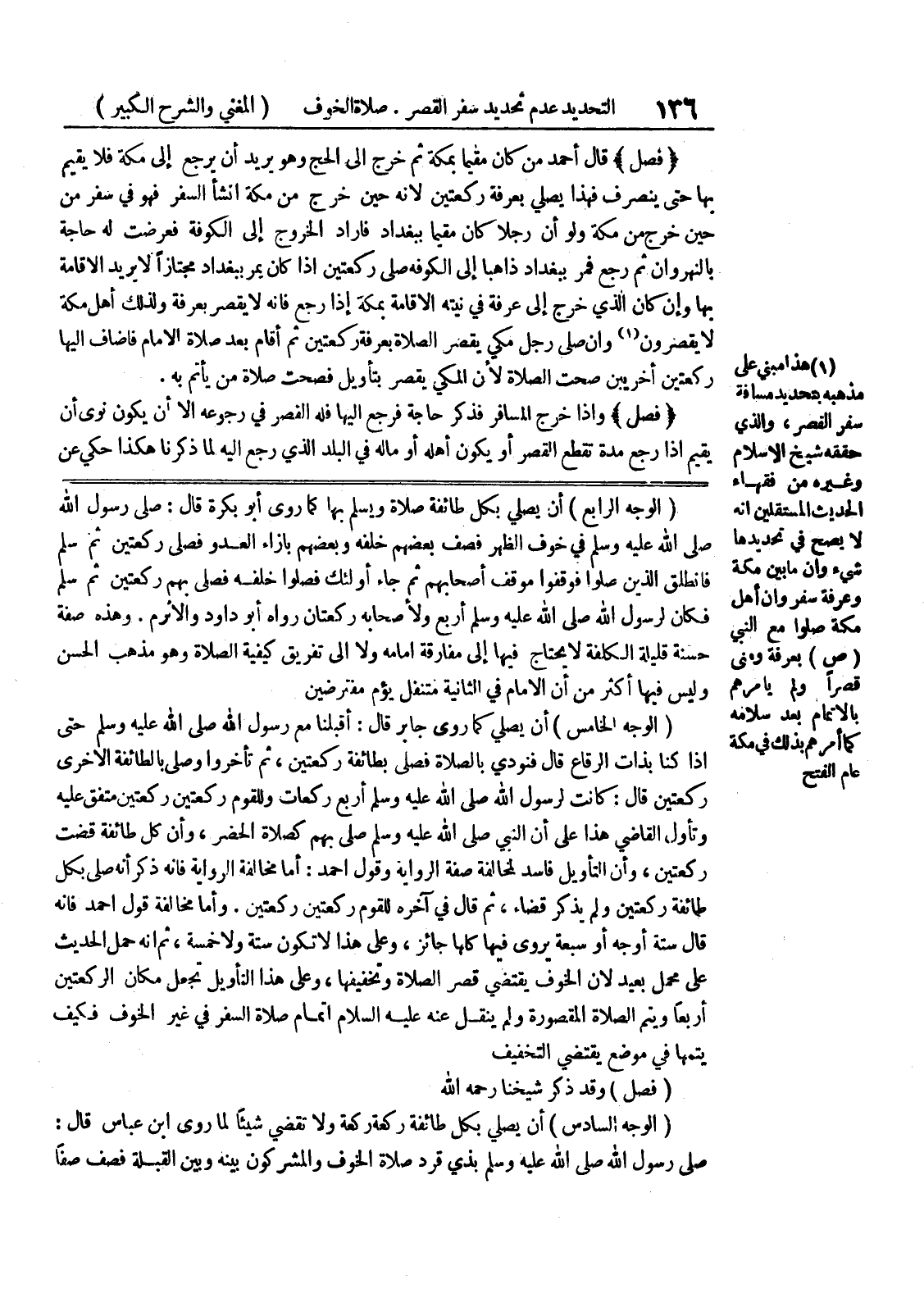 وهذه صفة حسنة قليلة الكلفة لا يحتاج فيها إلى مفارقة امامه ولا الى تفريق كيفية الصلاة وهو مذهب الحسن وليس فيها أكثر من أن الامام في الثانية متنفل يؤم مفترضين (الوجه الخامس) أن يصلي كما روى جابر قال: أقبلنا مع رسول الله صلى الله عليه وسلم حتى إذا كنا بذات الرقاع قال فنودي بالصلاة فصلى بطائفة ركعتين، ثم تأخروا وصلى بالطائفة الأخرى ركعتين قال: كانت لرسول الله صلى الله عليه وسلم أربع ركعات وللقوم ركعتين ركعتين متفق عليه وتأول القاضي هذا على أن النبي صلى الله عليه وسلم صلى بهم كصلاة الحضر، وأن كل طائفة قضت ركعتين، وأن التأويل فاسد لمخالفة صفة الرواية وقول أحمد: أما مخالفة الرواية فانه ذكر أنه صلى بكل طائفة ركعتين ولم يذكر قضاء، ثم قال في آخره للقوم ركعتين ركعتين.
