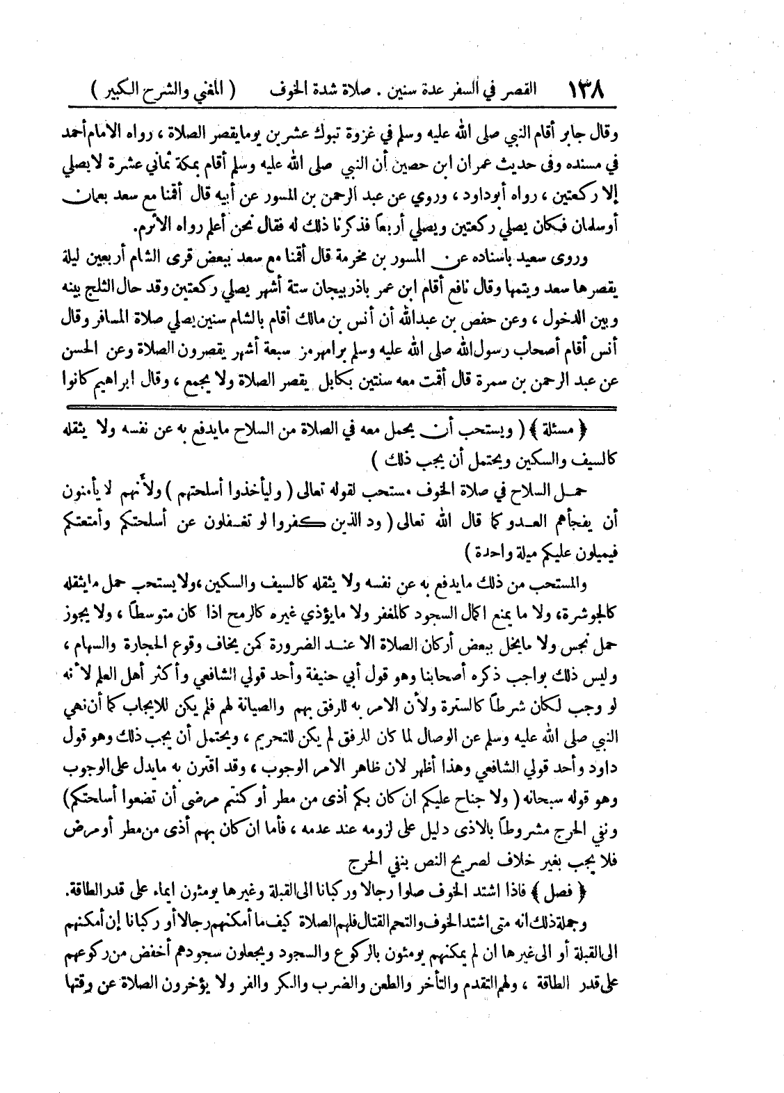 أن يفجأهم العدو كما قال الله تعالى (ود الذين كفروا لو تغفلون عن أسلحتكم وأمتعتكم فيميلون عليكم ميلة واحدة) والمستحب من ذلك ما يدفع به عن نفسه ولا يثقله كالسيف والسكين، ولا يستحب حمل ما يثقله كالجوشرة، ولا ما يمنع إكمال السجود كالمغفر ولا ما يؤذي غيره كالرمح اذا كان متوسطاً، ولا يجوز حمل نجس ولا ما يخل ببعض أركان الصلاة إلا عند الضرورة كمن يخاف وقوع الحجارة والسهام، وليس ذلك بواجب ذكره أصحابنا وهو قول أبي حنيفة وأحد قولي الشافعي وأكثر أهل العلم لأنه لو وجب لكان شرطاً كالسترة ولأن الأمر به للرفق بهم والصيانة لهم فلم يكن للايجاب كما أن نهى النبي صلى الله عليه وسلم عن الوصال لما كان للرفق لم يكن للتحريم، ويحتمل أن يجب ذلك وهو قول داود وأحد قولي الشافعي وهذا أظهر لأن ظاهر الأمر الوجوب، وقد اقترن به ما يدل على الوجوب وهو قوله سبحانه (ولا جناح عليكم إن كان بكم أذى من مطر أو كنتم مرضى أن تضعوا أسلحتكم) ونفي الحرج مشروطاً بالأذى دليل على لزومه عند عدمه، فأما إن كان بهم أذى من مطر أو مرض فلا يجب بغير خلاف لصريح النص بنفي الحرج * (فصل) * فاذا اشتد الخوف صلوا رجالاً وركباناً الى القبلة وغيرها يومئون ايماء على قدر الطاقة.