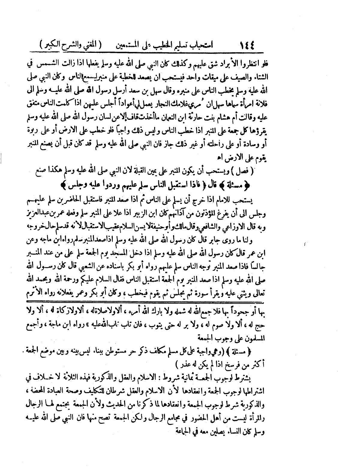 بها أو جحوداً بها فلا جمع الله له شمله ولا بارك الله أمره، ألا ولا صلاة له، ألا ولا زكاة له، ألا ولا حج له، ألا ولا صوم له، ولا بر له حتى يتوب، فإن تاب تاب الله عليه " رواه ابن ماجه، وأجمع المسلمون على وجوب الجمعة * (مسألة) * (وهي واجبة على كل مسلم مكلف ذكر حر مستوطن ببناء ليس بينه وبين موضع الجمعة.
