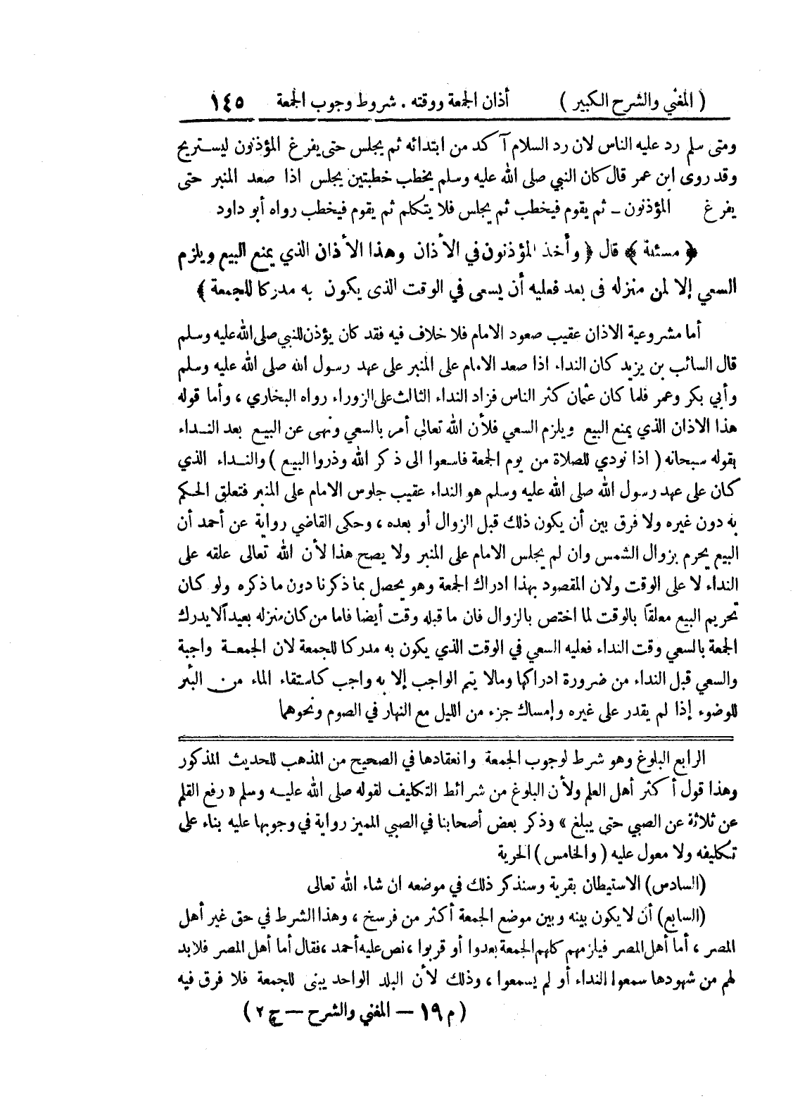 الرابع البلوغ وهو شرط لوجوب الجمعة وانعقادها في الصحيح من المذهب للحديث المذكور وهذا قول أكثر أهل العلم ولأن البلوغ من شرائط التكليف لقوله صلى الله عليه وسلم " رفع القلم عن ثلاثة عن الصبي حتى يبلغ " وذكر بعض أصحابنا في الصبي المميز رواية في وجوبها عليه بناء على تكليفه ولا معول عليه (والخامس) الحرية (السادس) الاستيطان بقرية وسنذكر ذلك في موضعه إن شاء الله تعالى (السابع) أن لا يكون بينه وبين موضع الجمعة أكثر من فرسخ، وهذا الشرط في حق غير أهل المصر، أما أهل المصر فيلزمهم كلهم الجمعة بعدوا أو قربوا، نص عليه أحمد، فقال أما أهل المصر فلابد لهم من شهودها سمعوا النداء أو لم يسمعوا، وذلك لأن البلد الواحد يبنى للجمعة فلا فرق فيه