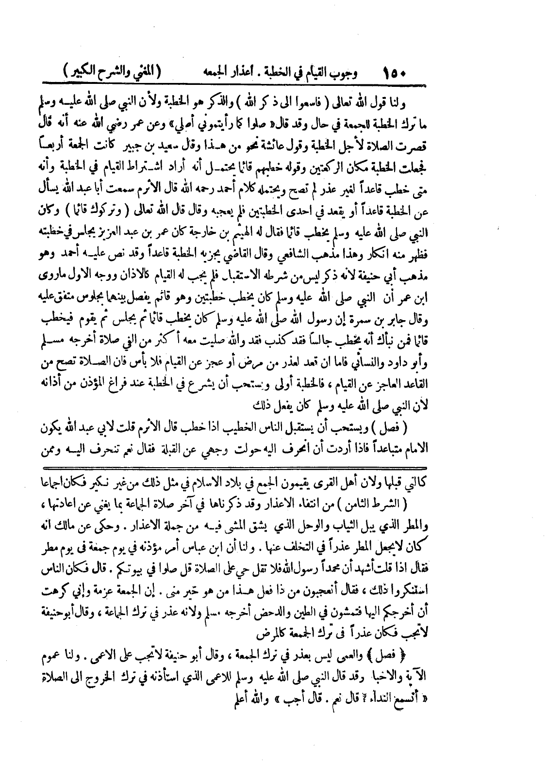 كالتي قبلها ولأن أهل القرى يقيمون الجمع في بلاد الإسلام في مثل ذلك من غير نكير فكان إجماعاً (الشرط الثامن) من انتفاء الاعذار وقد ذكرناها في آخر صلاة الجماعة بما يغني عن اعادتها، والمطر الذي يبل الثياب والوحل الذي يشق المشي فيه من جملة الاعذار.