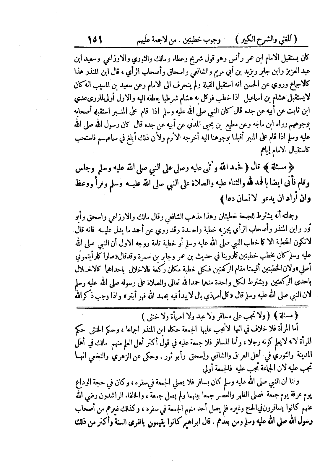 وحكي عن الزهري والنخعي أنها تجب عليه لأن الجماعة تجب عليه فالجمعة أولى ولنا أن النبي صلى الله عليه وسلم كان يسافر فلا يصلي الجمعة في سفره، وكان في حجة الوداع يوم عرفة يوم جمعة فصل الظهر والعصر جمعاً بينهما ولم يصل جمعة، والخلفاء الراشدون رضي الله عنهم كانوا يسافرون في الحج وغيره فلم يصل أحد منهم الجمعة في سفره، وكذلك غيرهم من أصحاب رسول الله صلى الله عليه وسلم ومن بعدهم.