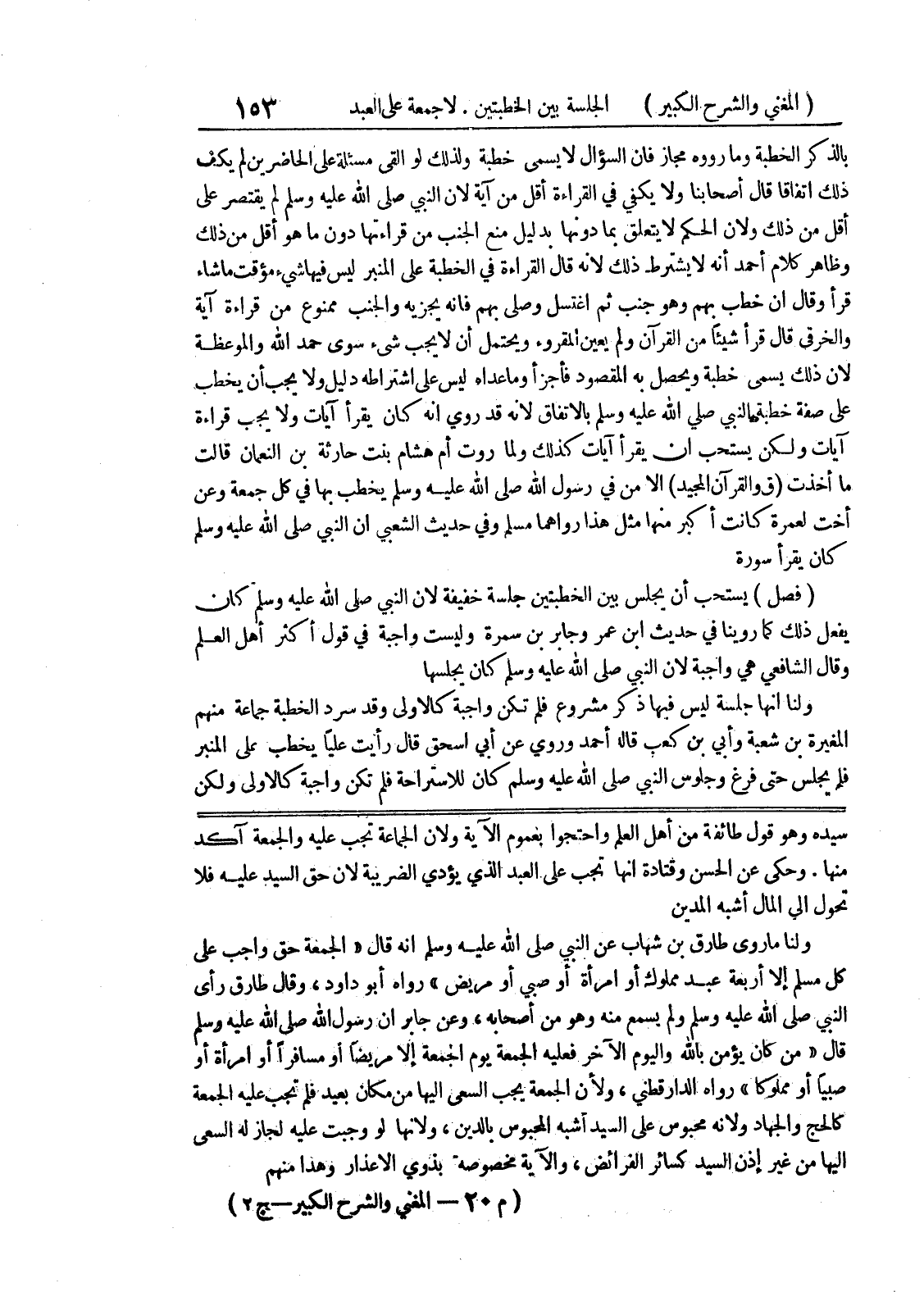 وحكي عن الحسن وقتادة أنها تجب على العبد الذي يؤدي الضريبة لأن حق السيد عليه فلا تحول الى المال أشبه المدين ولنا ما روى طارق بن شهاب عن النبي صلى الله عليه وسلم أنه قال " الجمعة حق واجب على كل مسلم إلا أربعة عبد مملوك أو امرأة أو صبي أو مريض " رواه أبو داود، وقال طارق رأى النبي صلى الله عليه وسلم ولم يسمع منه وهو من أصحابه، وعن جابر أن رسول الله صلى الله عليه وسلم قال " من كان يؤمن بالله واليوم الآخر فعليه الجمعة يوم الجمعة إلا مريضاً أو مسافراً أو امرأة أو صبياً أو مملوكاً " رواه الدارقطني، ولأن الجمعة يجب السعي إليها من مكان بعيد فلم تجب عليه الجمع كالحج والجهاد ولأنه محبوس على السيد أشبه المحبوس بالدين، ولأنها لو وجبت عليه لجاز له السعي إليها من غير إذن السيد كسائر الفرائض، والآية مخصوصة بذوي الاعذار وهذا منهم