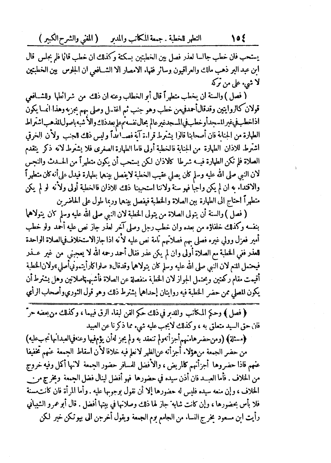 * (فصل) * وحكم المكاتب والمدبر في ذلك حكم القن لبقاء الرق فيهما، وكذلك من بعضه حر فان حق السيد متعلق به، وكذلك لا يجب عليه شئ مما ذكرنا عن العبيد * (مسألة) * (ومن حضرها منهم أجزأته ولم تنعقد به ولم يجز له أن يؤم فيها وعنه في العبد أنها تجب عليه) من حضر الجمعة من هؤلاء أجزأته عن الظهر لا نعلم فيه خلافا لأن إسقاط الجمعة عنهم تخفيفاً عنهم فاذا حضروها أجزأتهم كالمريض، والأفضل للمسافر حضور الجمعة لأنها أكمل وفيه خروج من الخلاف.