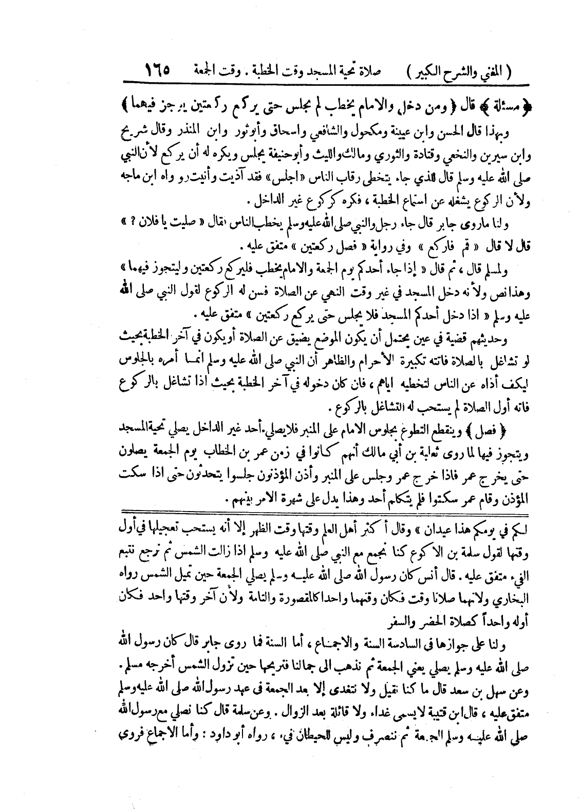 قال أنس كان رسول الله صلى الله عليه وسلم يصلي الجمعة حين تميل الشمس رواه البخاري ولأنهما صلاتا وقت فكان وقتهما واحدا كالمقصورة والتامة ولأن آخر وقتها واحد فكان أوله واحداً كصلاة الحضر والسفر ولنا على جوازها في السادسة السنة والإجماع، أما السنة فما روى جابر قال كان رسول الله صلى الله عليه وسلم يصلي يعني الجمعة ثم نذهب إلى جمالنا فنريحها حين تزول الشمس أخرجه مسلم.