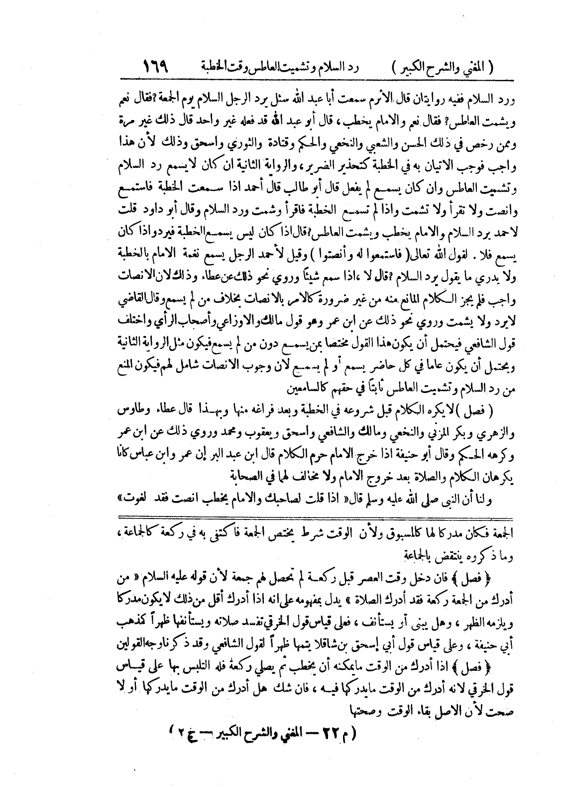 الجمعة فكان مدركاً لها كالمسبوق ولأن الوقت شرط يختص الجمعة فاكتفي به في ركعة كالجماعة، وما ذكروه ينتقض بالجماعة * (فصل) * فإن دخل وقت العصر قبل ركعة لم تحصل لهم جمعة لأن قوله عليه السلام " من أدرك من الجمعة ركعة فقد أدرك الصلاة " يدل بمفهومه على أنه إذا أدرك أقل من ذلك لا يكون مدركاً ويلزمه الظهر، وهل يبني أو يستأنف، فعلى قياس قول الخرقي تفسد صلاته ويستأنفها ظهراً كمذهب أبي حنيفة، وعلى قياس قول أبي إسحق بن شاقلا يتمها ظهراً لقول الشافعي وقد ذكرنا وجه القولين * (فصل) * إذا أدرك من الوقت ما يمكنه أن يخطب ثم يصلي ركعة فله التلبس بها على قياس قول الخرقي لأنه أدرك من الوقت ما يدركها فيه، فان شك هل أدرك من الوقت ما يدركها أو لا صحت لأن الأصل بقاء الوقت وصحتها