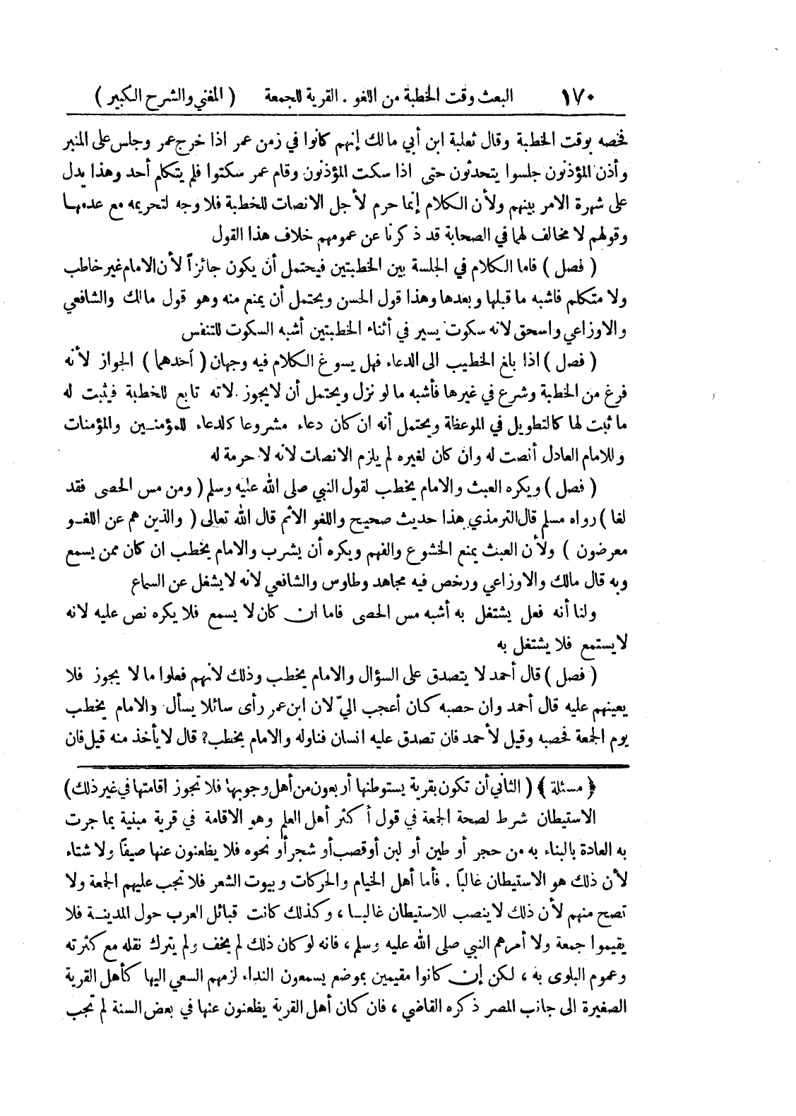 فأما أهل الخيام والحركات وبيوت الشعر فلا تجب عليهم الجمعة ولا تصح منهم لأن ذلك لا ينصب للإستيطان غالباً، وكذلك كانت قبائل العرب حول المدينة فلا يقيموا جمعة ولا أمرهم النبي صلى الله عليه وسلم، فإنه لو كان ذلك لم يخف ولم يترك نقله مع كثرته وعموم البلوى به، لكن إن كانوا مقيمين بموضع يسمعون النداء لزمهم السعي اليها كاهل القرية الصغيرة الى جانب المصر ذكره القاضي، فان كان أهل القرية يظعنون عنها في بعض السنة لم تجب