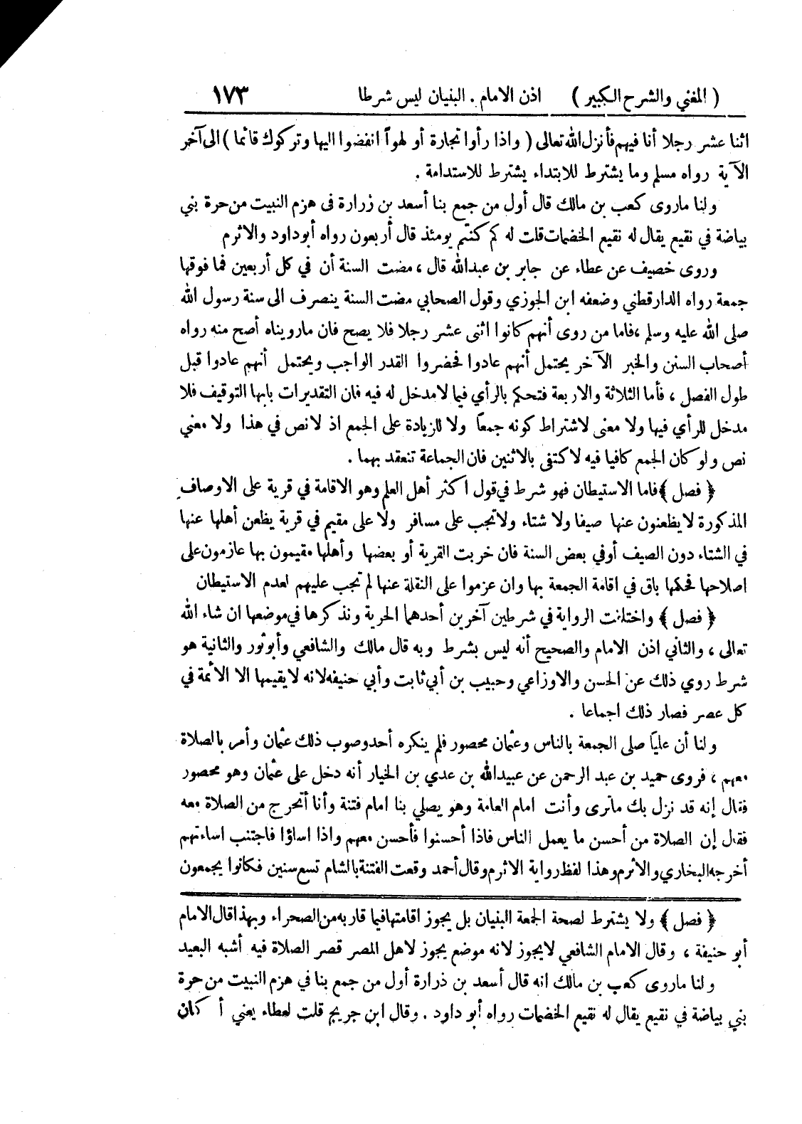 * (فصل) * ولا يشترط لصحة الجمعة البنيان بل يجوز اقامتها فيما قاربه من الصحراء وبهذا قال الإمام أبو حنيفة، وقال الإمام الشافعي لا يجوز لأنه موضع يجوز لأهل المصر قصر الصلاة فيه أشبه البعيد