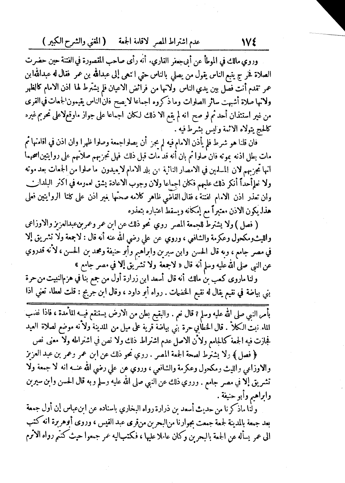 قال الخطابي حرة بني بياضة قرية على ميل من المدينة ولأنه موضع لصلاة العيد فجازت فيه الجمعة كالجامع ولأن الاصل إشتراط ذلك ولا نص في اشتراطه ولا معنى نص * (فصل) * ولا يشترط لصحة الجمعة المصر.