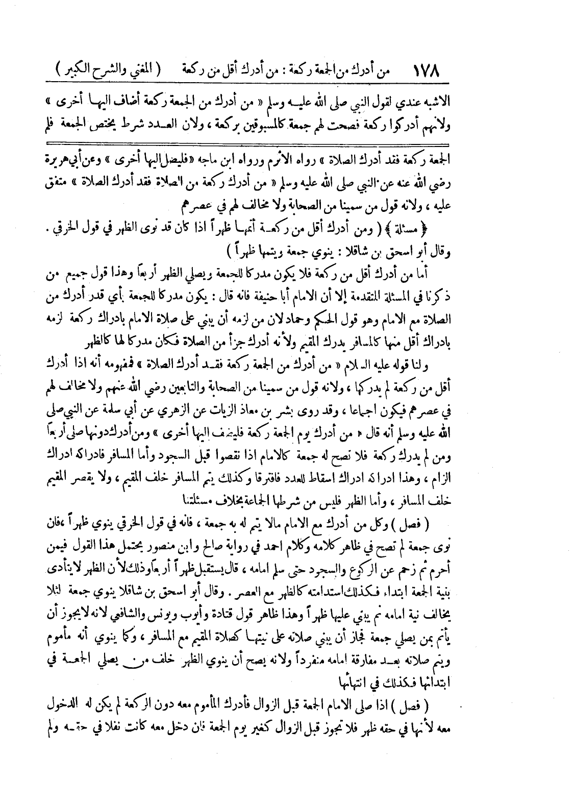 الجمعة ركعة فقد أدرك الصلاة " رواه الأثرم ورواه ابن ماجة " فليصل إليها أخرى " وعن أبي هريرة رضي الله عنه عن النبي صلى الله عليه وسلم " من أدرك ركعة من الصلاة فقد أدرك الصلاة " متفق عليه، ولأنه قول من سمينا من الصحابة ولا مخالف لهم في عصرهم * (مسألة) * (ومن أدرك أقل من ركعة أتمها ظهراً إذا كان قد نوى الظهر في قول الخرقي.