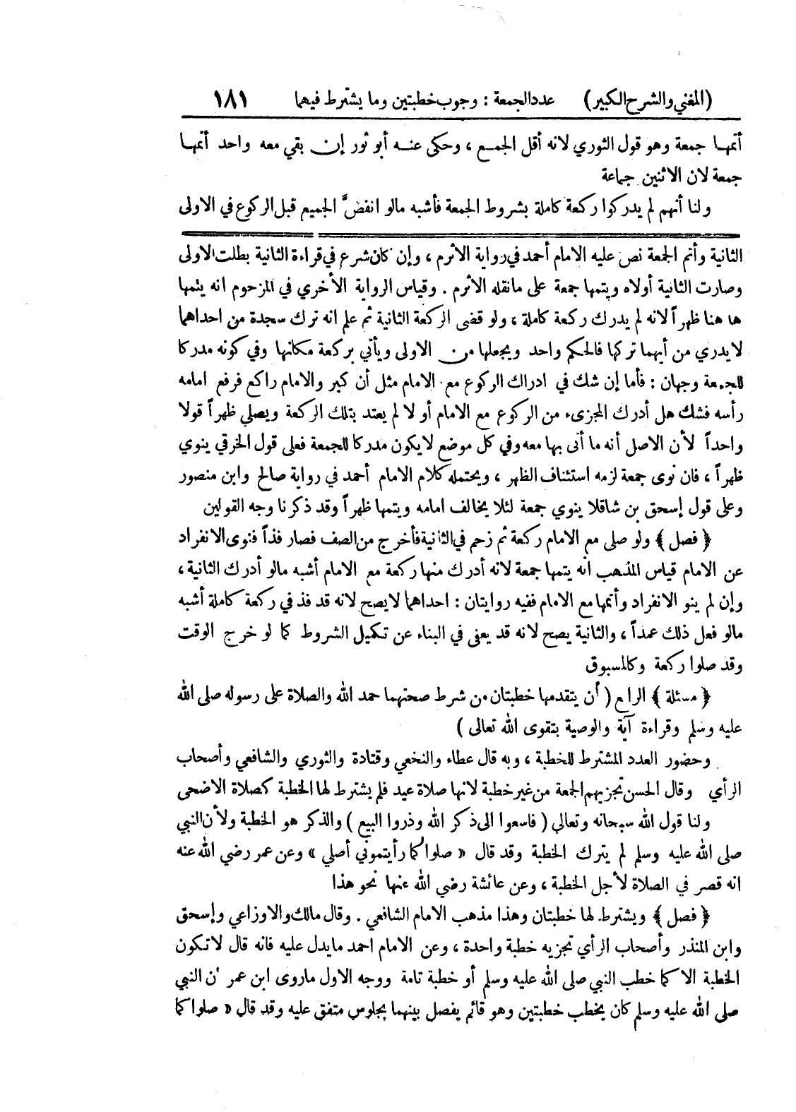 وقياس الرواية الأخرى في المزحوم أنه يتمها ها هنا ظهراً لأنه لم يدرك ركعة كاملة، ولو قضى الركعة الثانية ثم علم أنه ترك سجدة من إحداهما لا يدري من أيهما تركها فالحكم واحد ويجعلها من الاولى ويأتي بركعة مكانها وفي كونه مدركاً للجمعة وجهان: فأما إن شك في ادراك الركوع مع الامام مثل أن كبر والامام راكع فرفع إمامه رأسه فشك هل أدرك المجزئ من الركوع مع الإمام أو لا لم يعتد بتلك الركعة ويصلي ظهراً قولا واحدا لأن الأصل أنه ما أتى بها معه وفي كل موضع لا يكون مدركاً للجمعة فعلى قول الخرقي ينوي ظهراً، فان نوى جمعة لزمه استئناف الظهر، ويحتمله كلام الامام أحمد في رواية صالح وابن منصور وعلى قول إسحق بن شاقلا ينوي جمعة لئلا يخالف إمامه ويتمها ظهراً وقد ذكرنا وجه القولين * (فصل) * ولو صلى مع الإمام ركعة ثم زحم في الثانية فأخرج من الصف فصار فذاً فنوى الانفراد عن الامام قياس المذهب أنه يتمها جمعة لأنه أدرك منها ركعة مع الامام أشبه ما لو أدرك الثانية، وإن لم ينو الانفراد وأتمها مع الإمام ففيه روايتان: إحداهما لا يصح لأنه قد فذ في ركعة كاملة أشبه ما لو فعل ذلك عمداً، والثانية يصح لأنه قد يعفى في البناء عن تكميل الشروط كما لو خرج الوقت وقد صلوا ركعة وكالمسبوق * (مسألة) * الرابع (أن يتقدمها خطبتان من شرط صحتهما حمد الله والصلاة على رسوله صلى الله عليه وسلم وقراءة أية والوصية بتقوى الله تعالى) وحضور العدد المشترط للخطبة، وبه قال عطاء والنخعي وقتادة والثوري والشافعي وأصحاب الرأي وقال الحسن تجزيهم الجمعة من غير خطبة لأنها صلاة عيد فلم يشترط لها الخطبة كصلاة الأضحى ولنا قول الله سبحانه وتعالى (فاسعوا إلى ذكر الله وذروا البيع) والذكر هو الخطبة ولأن النبي صلى الله عليه وسلم لم يترك الخطبة وقد قال " صلوا كما رأيتموني أصلي " وعن عمر رضي الله عنه أنه قصر في الصلاة لأجل الخطبة، وعن عائشة رضي الله عنها نحو هذا * (فصل) * ويشترط لها خطبتان وهذا مذهب الامام الشافعي.