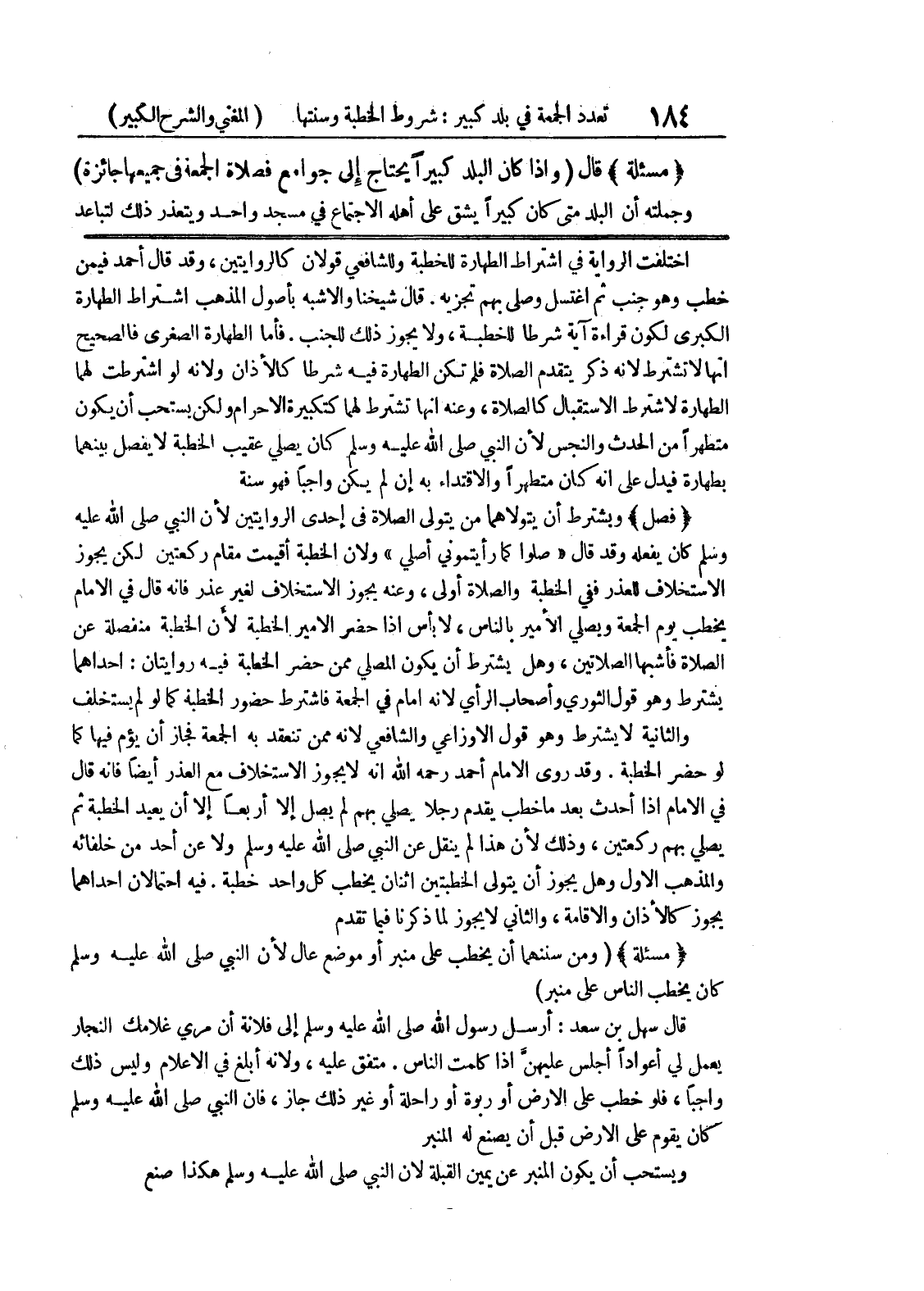 فأما الطهارة الصغرى فالصحيح أنها لا تشترط لأنه ذكر يتقدم الصلاة فلم تكن الطهارة فيه شرط كالأذان ولأنه لو اشترطت لهما الطهارة لاشترط الاستقبال كالصلاة، وعنه أنها تشترط لهما كتكبيرة الاحرام ولكن يستحب أن يكون متطهراً من الحدث والنجس لأن النبي صلى الله عليه وسلم كان يصلي عقيب الخطبة لا يفصل بينهما بطهارة فيدل على أنه كان متطهراً والاقتداء به إن لم يكن واجبا فهو سنة * (فصل) * ويشترط أن يتولاهما من يتولى الصلاة في إحدى الروايتين لأن النبي صلى الله عليه وسلم كان يفعله وقد قال " صلوا كما رأيتموني أصلي " ولأن الخطبة أقيمت مقام ركعتين لكن يجوز الاستخلاف للعذر ففي الخطبة والصلاة أولى، وعنه يجوز الاستخلاف لغير عذر فإنه قال في الامام يخطب يوم الجمعة ويصلي الأمير بالناس، لا بأس إذا حضر الامير الخطبة لأن الخطبة منفصلة عن