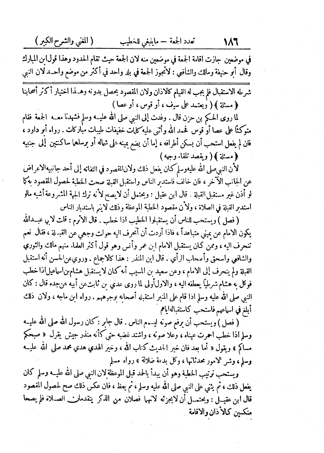 رواه أبو داود، فان لم يفعل استحب أن يسكن أطرافه، إما أن يضع يمينه على شماله أو يرسلهما ساكنتين إلى جنبيه * (مسألة) * (ويقصد تلقاء وجهه) لأن النبي صلى الله عليه وسلم كان يفعل ذلك ولأن المقصود في التفاته إلى أحد جانبيه الاعراض عن الجانب الآخر، فان خالف فاستدبر الناس واستقبل القبلة صحت الخطبة لحصول المقصود به كما لو أذن غير مستقبل القبلة.