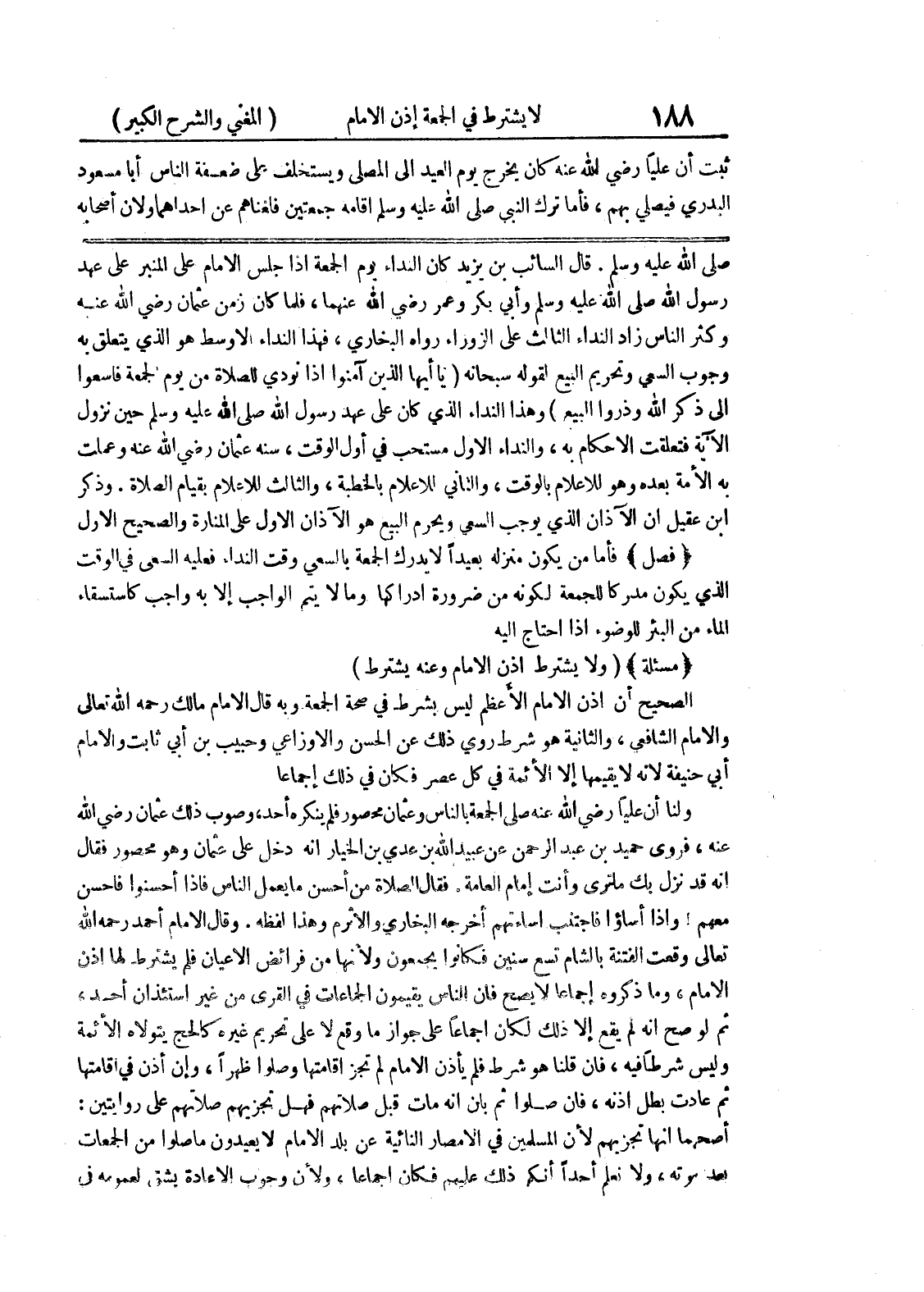 وذكر ابن عقيل أن الآذان الذي يوجب السعي ويحرم البيع هو الآذان الاول على المنارة والصحيح الأول * (فصل) * فأما من يكون منزله بعيداً لا يدرك الجمعة بالسعي وقت النداء فعليه السعي في الوقت الذي يكون مدركاً للجمعة لكونه من ضرورة ادراكها وما لا يتم الواجب إلا به واجب كاستسقاء الماء من البئر للوضوء إذا احتاج إليه * (مسألة) * (ولا يشترط إذن الإمام وعنه يشترط) الصحيح أن اذن الامام الأعظم ليس بشرط في صحة الجمعة وبه قال الامام مالك رحمه الله تعالى والامام الشافعي، والثانية هو شرط روى ذلك عن الحسن والاوزاعي وحبيب بن أبي ثابت والامام أبي حنيفة لأنه لا يقيمها إلا الأئمة في كل عصر فكان في ذلك إجماعاً