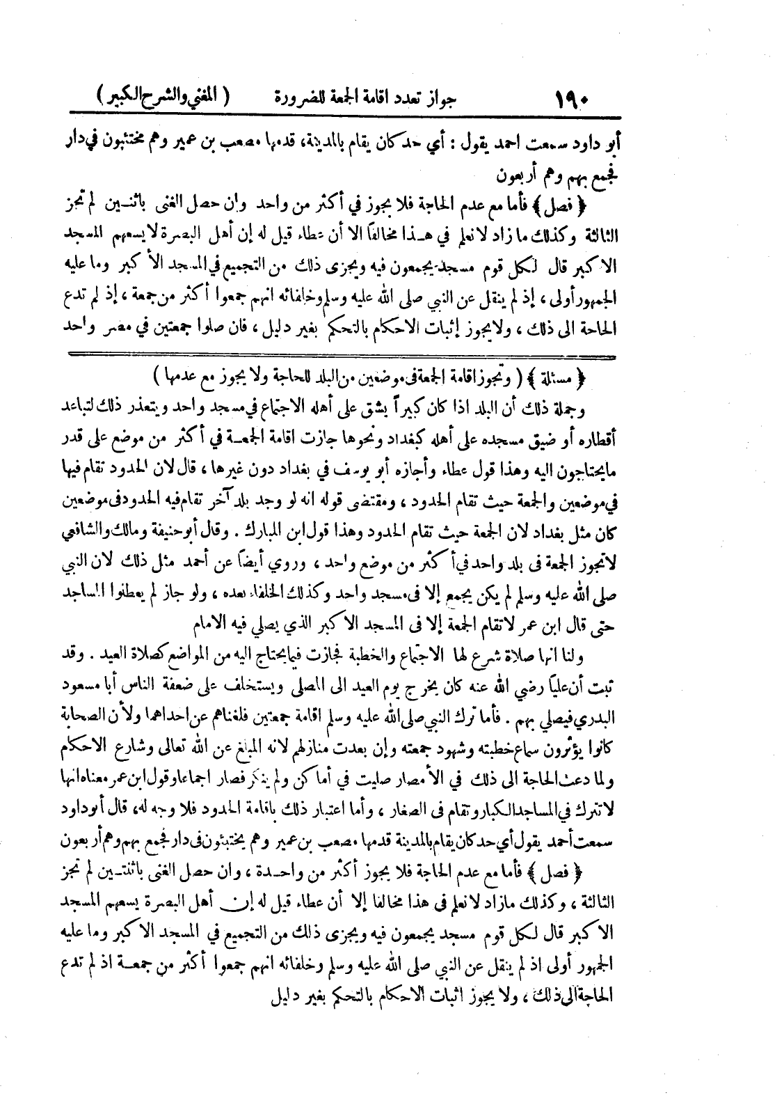 * (مسألة) * (وتجوز إقامة الجمعة في موضعين من البلد للحاجة ولا يجوز مع عدمها) وجملة ذلك أن البلد اذا كان كبيراً يشق على أهله الاجتماع في مسجد واحد ويتعذر ذلك لتباعد أقطاره أو ضيق مسجده على أهله كبغداد ونحوها جازت إقامة الجمعة في أكثر من موضع على قدر ما يحتاجون إليه وهذا قول عطاء وأجازه أبو يوسف في بغداد دون غيرها، قال لأن الحدود تقام فيها في موضعين والجمعة حيث تقام الحدود، ومقتضى قوله أنه لو وجد بلد آخر تقام فيه الحدود في موضعين كان مثل بغداد لأن الجمعة حيث تقام الحدود وهذا قول ابن المبارك.