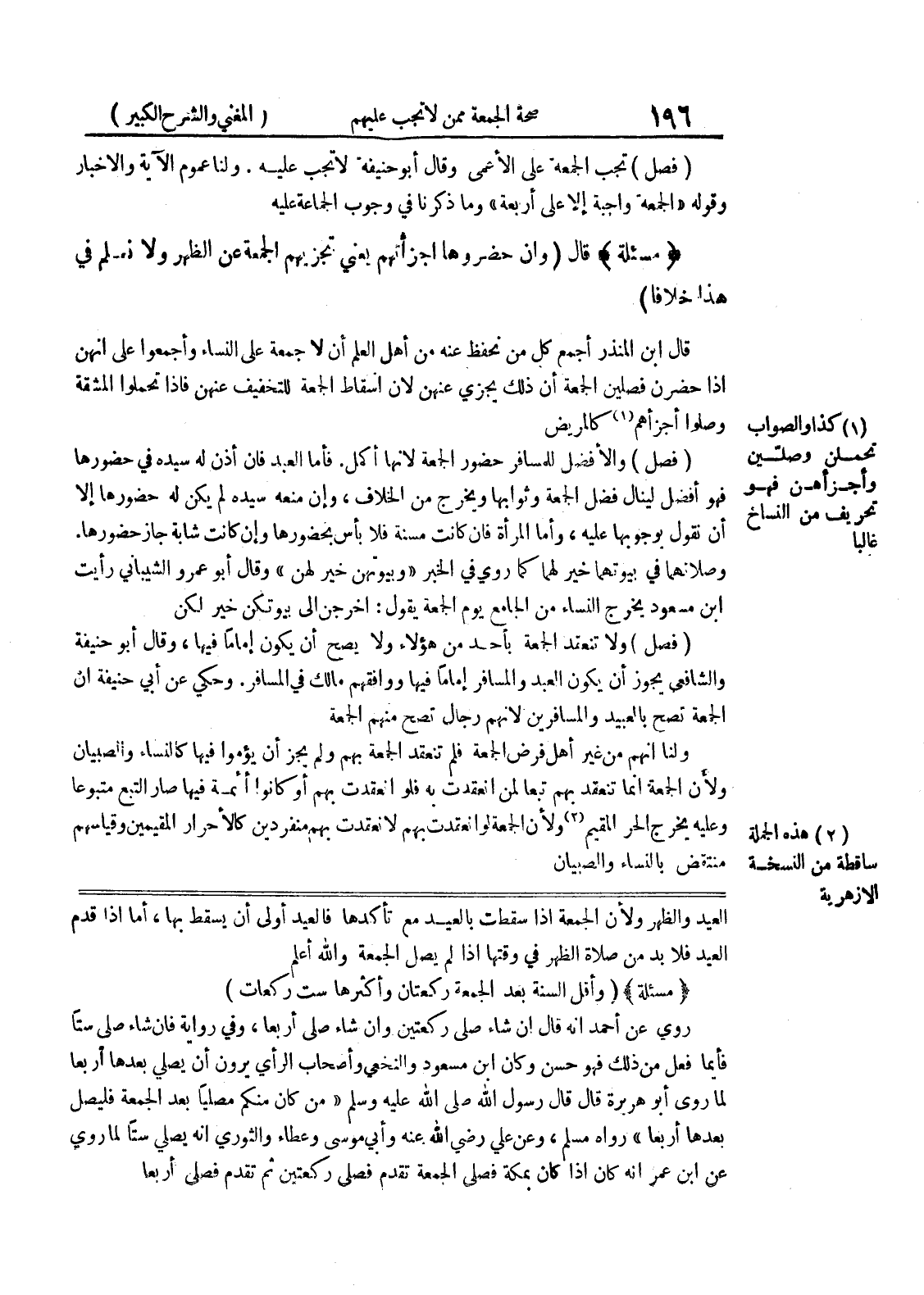 العيد والظهر ولأن الجمعة اذا سقطت بالعيد مع تأكدها فالعيد أولى أن يسقط بها، أما إذا قدم العيد فلابد من صلاة الظهر في وقتها اذا لم يصل الجمعة والله أعلم * (مسألة) * (وأقل السنة بعد الجمعة ركعتان وأكثرها ست ركعات) روي عن أحمد أنه قال إن شاء صلى ركعتين وان شاء صلى أربعا، وفي رواية فان شاء صلى ستاً فأيما فعل من ذلك فهو حسن وكان ابن مسعود والنخعي وأصحاب الرأي يرون أن يصلي بعدها أربعا لما روى أبو هريرة قال قال رسول الله صلى الله عليه وسلم " من كان منكم مصلياً بعد الجمعة فليصل بعدها أربعا " رواه مسلم، وعن علي رضي الله عنه وأبي موسى وعطاء والثوري أنه يصلي ستاً لما روي عن ابن عمر أنه كان إذا كان بمكة فصلى الجمعة تقدم فصلى ركعتين ثم تقدم فصلى أربعاً