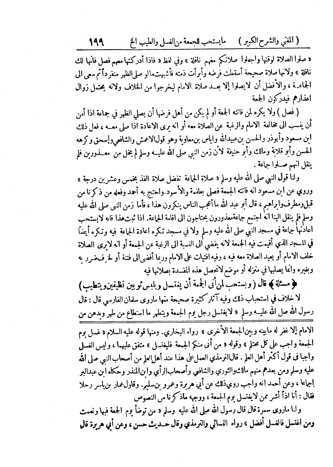 وقاول عمار بن ياسر رحلا فقال: أنا اذاً أشر ممن لا يغتسل يوم الجمعة، ووجهه ما ذكرنا من النصوص ولنا ما روى سمرة قال قال رسول الله صلى الله عليه وسلم " من توضأ يوم الجمعة فبها ونعمت ومن اغتسل فالغسل أفضل " رواه النسائي والترمذي وقال حديث حسن، وعن أبي هريرة قال