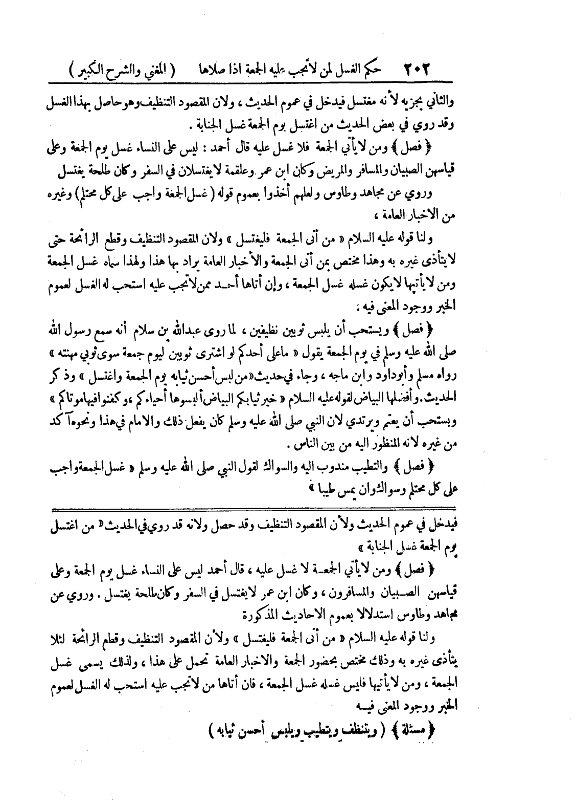 وروي عن مجاهد وطاوس استدلالا بعموم الأحاديث المذكورة ولنا قوله عليه السلام " من أتى الجمعة فليغتسل " ولأن المقصود التنظيف وقطع الرائحة لئلا يتأذى غيره به وذلك مختص بحضور الجمعة والأخبار العامة تحمل على هذا، ولذلك يسمى غسل الجمعة، ومن لا يأتيها فليس غسله غسل الجمعة، فإن أتاها من لا تجب عليه استحب له الغسل لعموم الخبر ووجود المعنى فيه * (مسألة) * (ويتنظف ويتطيب ويلبس أحسن ثيابه)