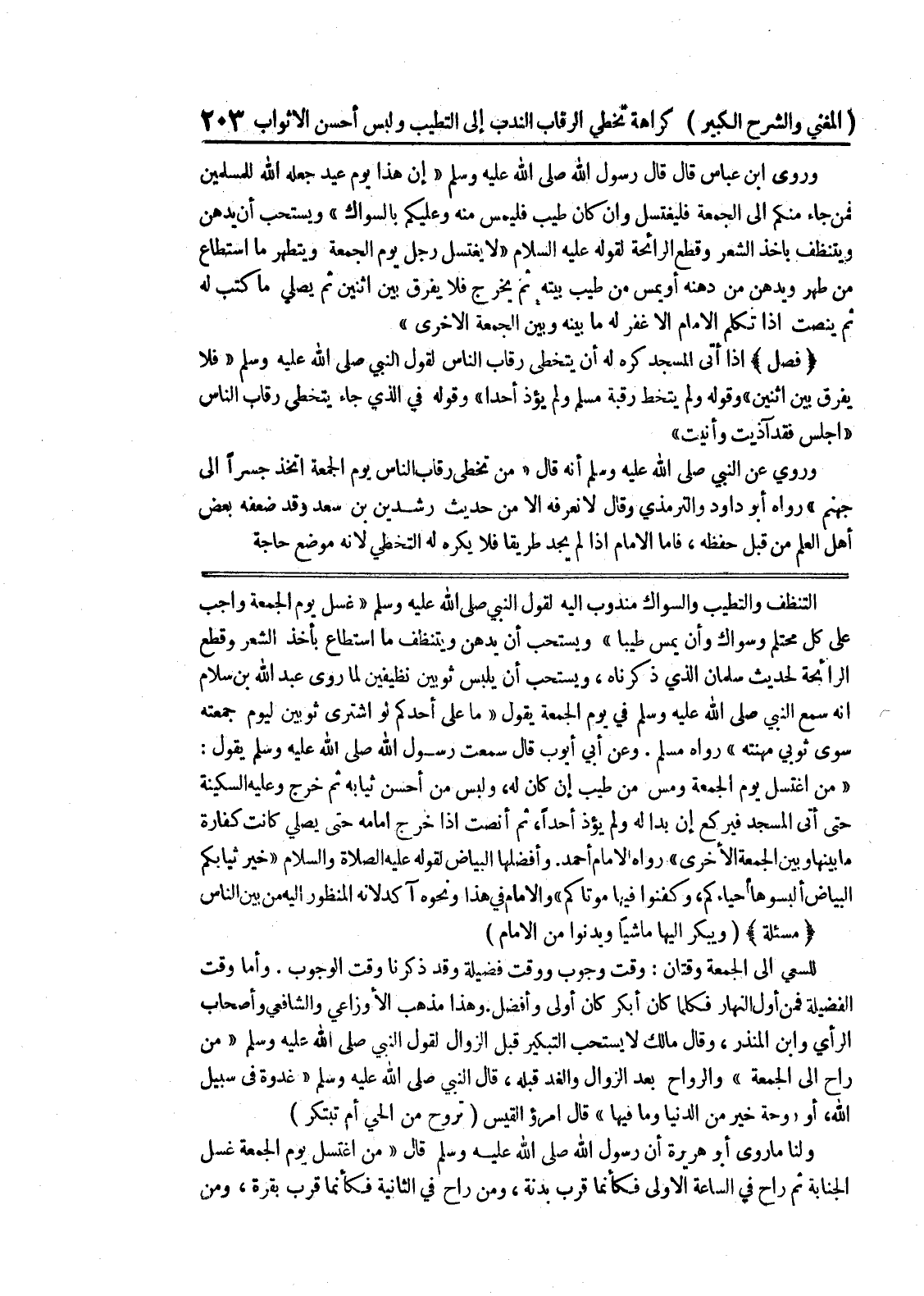 وأفضلها البياض لقوله عليه الصلاة والسلام " خير ثيابكم البياض ألبسوها أحياءكم، وكفنوا فيها موتاكم " والامام في هذا ونحوه آكد لأنه المنظور إليه من بين الناس * (مسألة) * (ويبكر إليها ماشيا ويدنوا من الإمام) للسعي الى الجمعة وقتان: وقت وجوب ووقت فضيلة وقد ذكرنا وقت الوجوب.