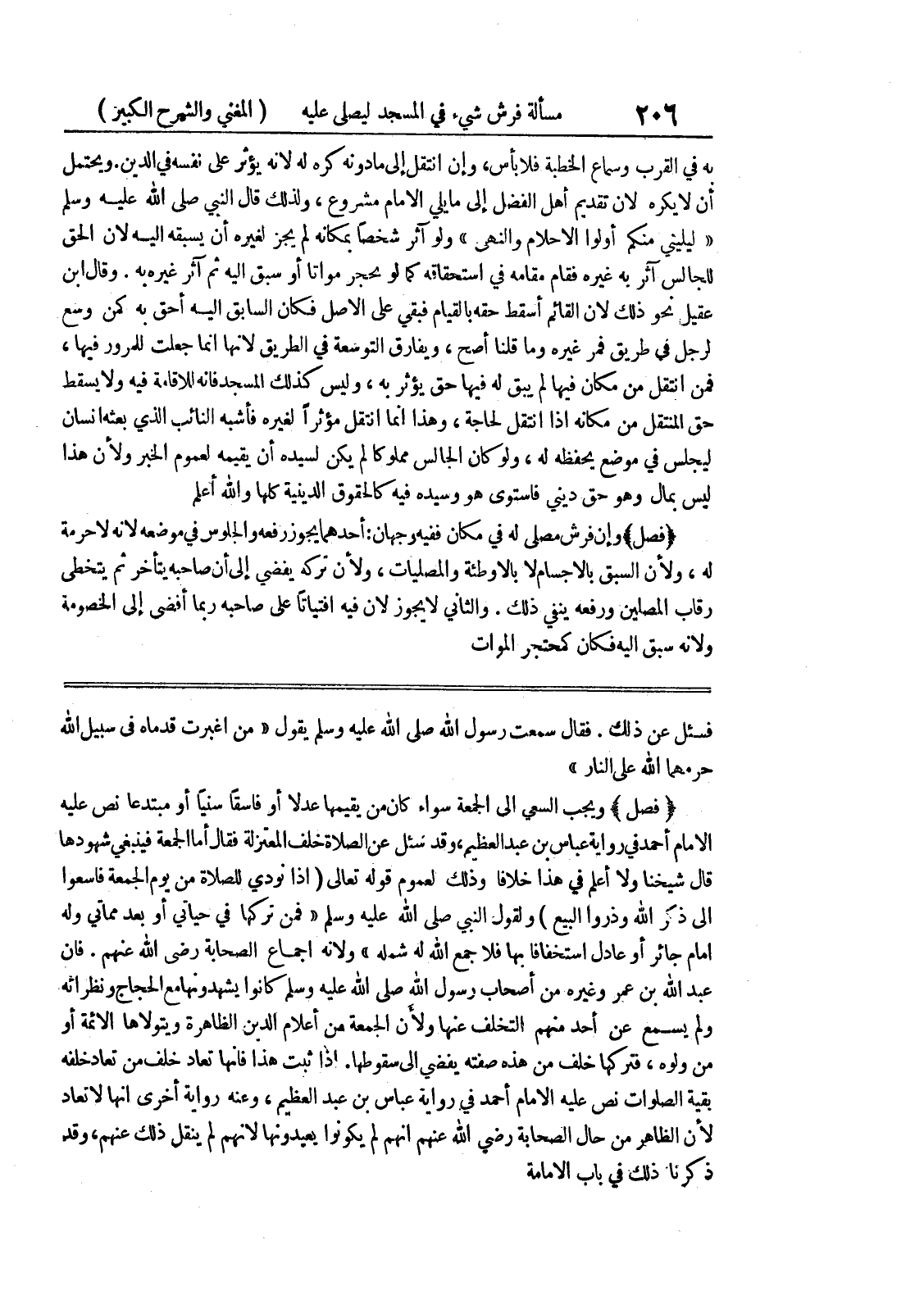 فقال سمعت رسول الله صلى الله عليه وسلم يقول " من اغبرت قدماه في سبيل الله حرمهما الله على النار " * (فصل) * ويجب السعي الى الجمعة سواء كان من يقيمها عدلاً أو فاسقاً سنياً أو مبتدعا نص عليه الامام أحمد في رواية عباس بن عبد العظيم، وقد سئل عن الصلاة خلف المعتزلة فقال أما الجمعة فينبغي شهودها قال شيخنا ولا أعلم في هذا خلافا وذلك لعموم قوله تعالى (إذا نودي للصلاة من يوم الجمعة فاسعوا إلى ذكر الله وذروا البيع) ولقول النبي صلى الله عليه وسلم " فمن تركها في حياتي أو بعد مماتي وله إمام جائر أو عادل استخفافاً بها فلا جمع الله له شمله " ولأنه إجماع الصحابة رضي الله عنهم.