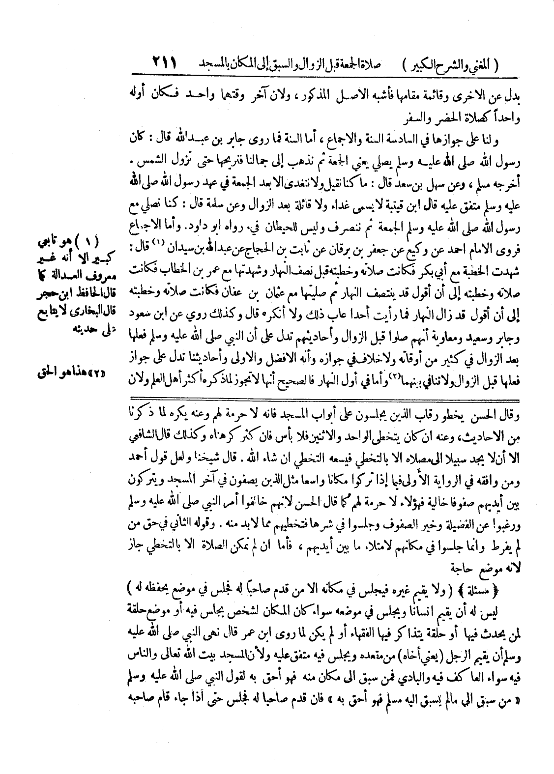 وقوله الثاني في حق من لم يفرط وإنما جلسوا في مكانهم لامتلاء ما بين أيديهم، فأما إن لم تمكن الصلاة الا بالتخطي جاز لأنه موضع حاجة * (مسألة) * (ولا يقيم غيره فيجلس في مكانه إلا من قدم صاحباً له فجلس في موضع يحفظه له) ليس له أن يقيم إنساناً ويجلس في موضعه سواء كان المكان لشخص يجلس فيه أو موضع حلقة لمن يحدث فيها أو حلقة يتذاكر فيها الفقهاء أو لم يكن لما روى ابن عمر قال نهى النبي صلى الله عليه وسلم أن يقيم الرجل (يعني أخاه) من مقعده ويجلس فيه متفق عليه ولأن المسجد بيت الله تعالى والناس فيه سواء العاكف فيه والبادي فمن سبق الى مكان منه فهو أحق به لقول النبي صلى الله عليه وسلم " من سبق إلى ما لم يسبق إليه مسلم فهو أحق به " فإن قدم صاحباً له فجلس حتى إذا جاء قام صاحبه