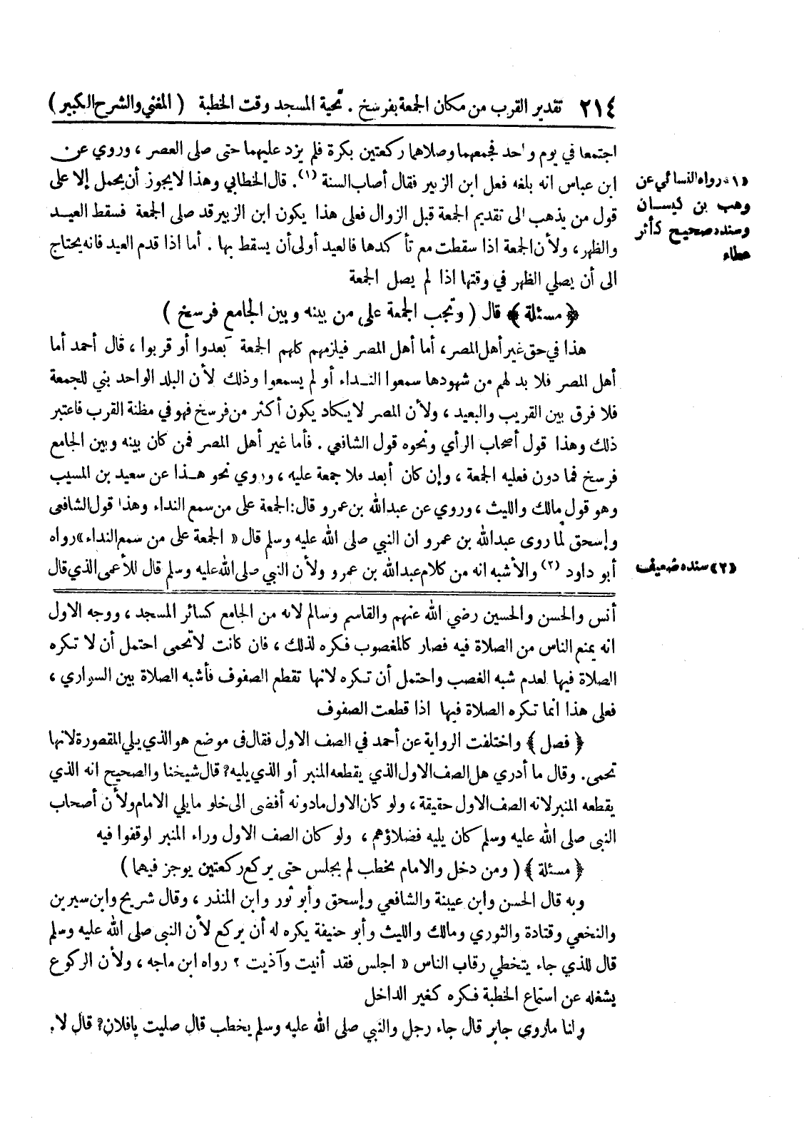وقال ما أدري هل الصف الاول الذي يقطعه المنبر أو الذي يليه؟ قال شيخنا والصحيح أنه الذي يقطعه المنبر لأنه الصف الاول حقيقة، ولو كان الأول ما دونه أفضى الى خلو ما يلي الامام ولأن أصحاب النبي صلى الله عليه وسلم كان يليه فضلاؤهم، ولو كان الصف الاول وراء المنبر لوقفوا فيه * (مسألة) * (ومن دخل والإمام يخطب لم يجلس حتى يركع ركعتين يوجز فيهما) وبه قال الحسن وابن عيبنة والشافعي وإسحق وأبو ثور وابن المنذر، وقال شريح وابن سيرين والنخعي وقتادة والثوري ومالك والليث وأبو حنيفة يكره له أن يركع لأن النبي صلى الله عليه وسلم قال للذي جاء يتخطى رقاب الناس " اجلس فقد أنيت وآذيت " رواه ابن ماجه، ولأن الركوع يشغله عن استماع الخطبة فكره كغير الداخل ولنا ما روى جابر قال جاء رجل والنبي صلى الله عليه وسلم يخطب قال صليت يا فلان؟ قال لا.
