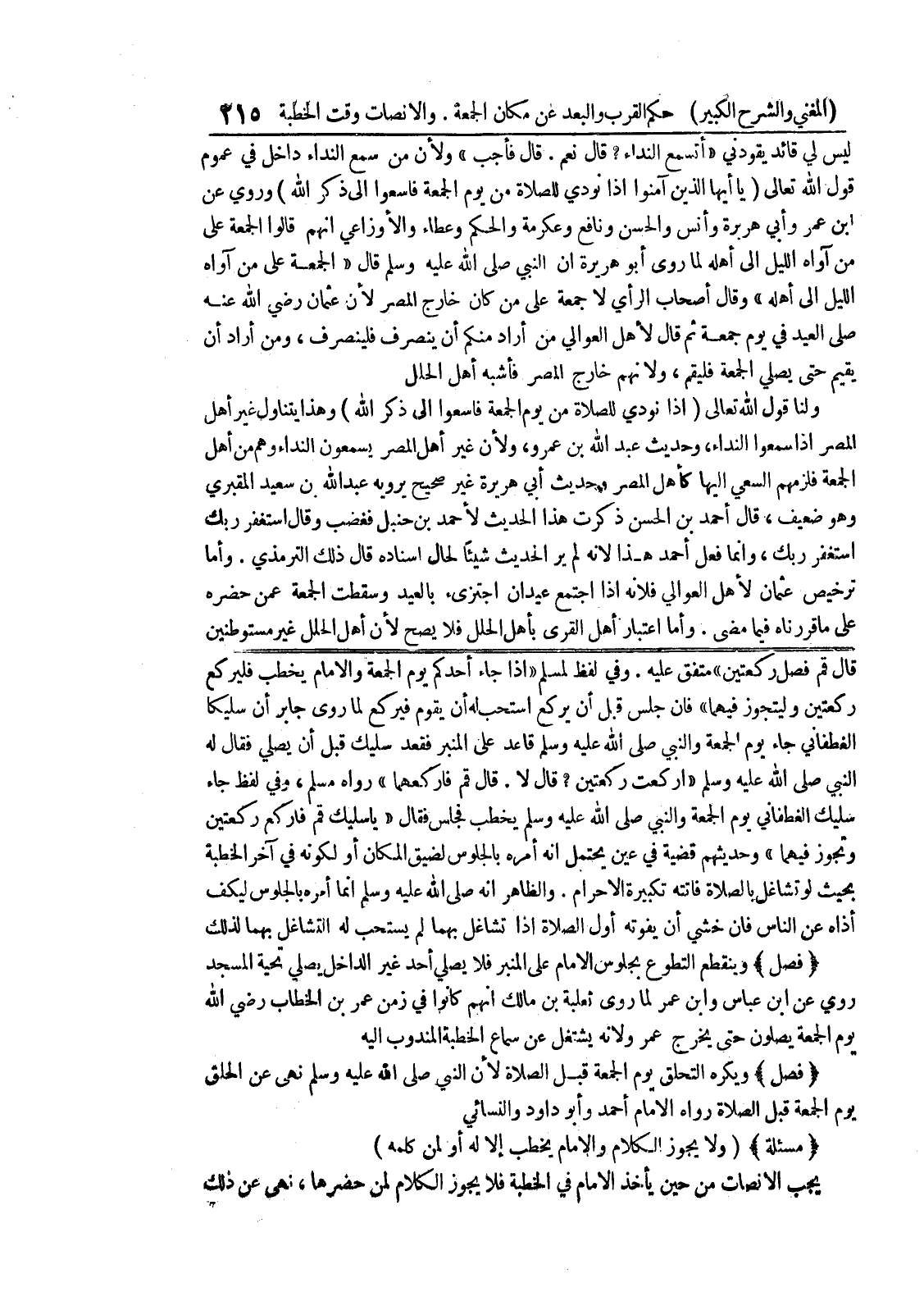 والظاهر أنه صلى الله عليه وسلم إنما أمره بالجلوس ليكف أذاه عن الناس فان خشي أن يفوته أول الصلاة اذا تشاغل بهما لم يستحب له التشاغل بهما لذلك * (فصل) * وينقطع التطوع بجلوس الإمام على المنبر فلا يصلي أحد غير الداخل يصلي تحية المسجد روي عن ابن عباس وابن عمر لما روى ثعلبة بن مالك أنهم كانوا في زمن عمر بن الخطاب رضي الله يوم الجمعة يصلون حتى يخرج عمر ولأنه يشتغل عن سماع الخطبة المندوب اليه * (فصل) * ويكره التحلق يوم الجمعة قبل الصلاة لأن النبي صلى الله عليه وسلم نهى عن الحلق يوم الجمعة قبل الصلاة رواه الإمام أحمد وأبو داود والنسائي * (مسألة) * (ولا يجوز الكلام والإمام يخطب إلا له أو لمن كلمه) يجب الانصات من حين يأخذ الامام في الخطبة فلا يجوز الكلام لمن حضرها، نهى عن ذلك