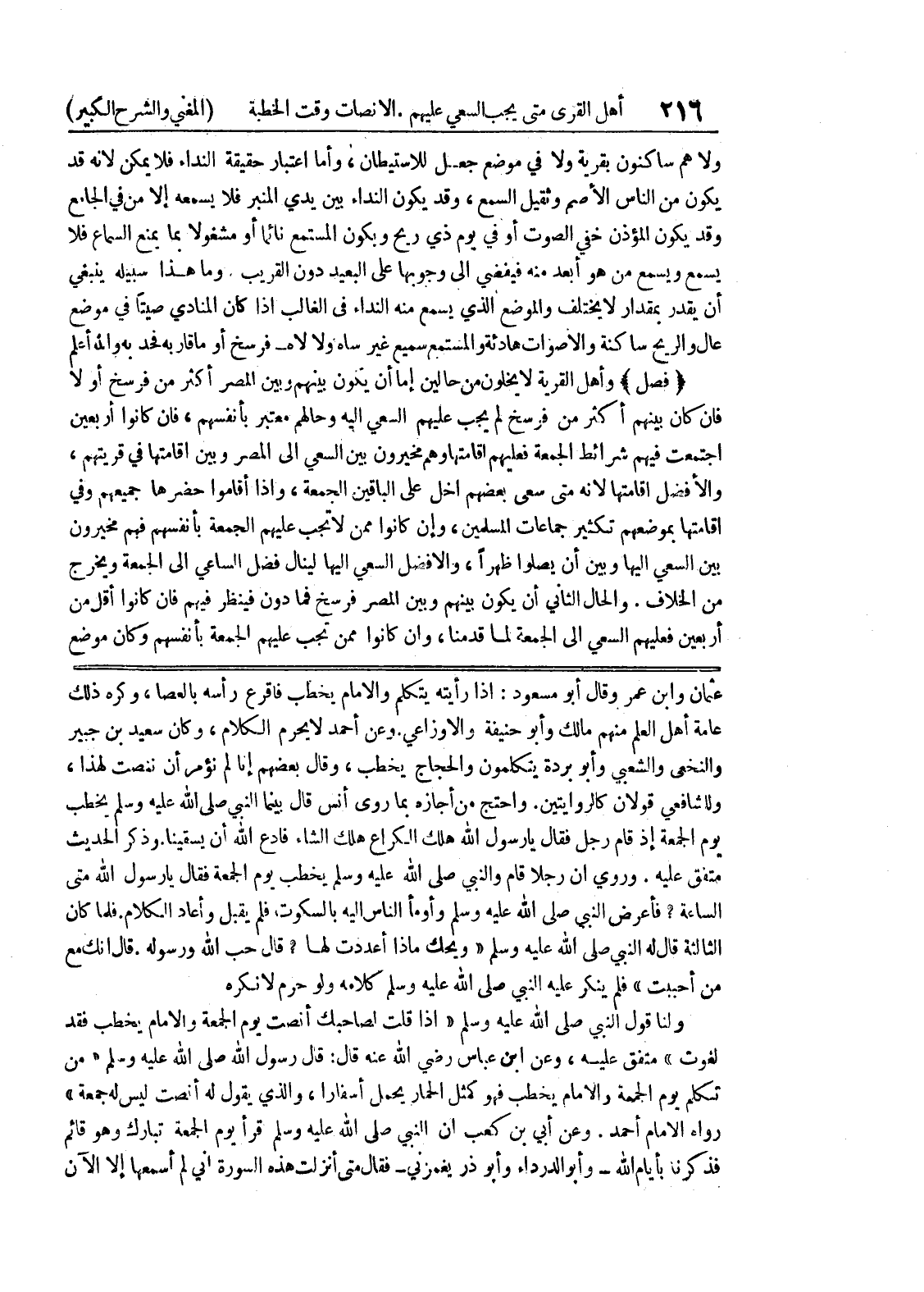 قال إنك مع من أحببت " فلم ينكر عليه النبي صلى الله عليه وسلم كلامه ولو حرم لا نكره ولنا قول النبي صلى الله عليه وسلم " إذا قلت لصاحبك أنصت يوم الجمعة والإمام يخطب فقد لغوت " متفق عليه، وعن ابن عباس رضي الله عنه قال: قال رسول الله صلى الله عليه وسلم " من