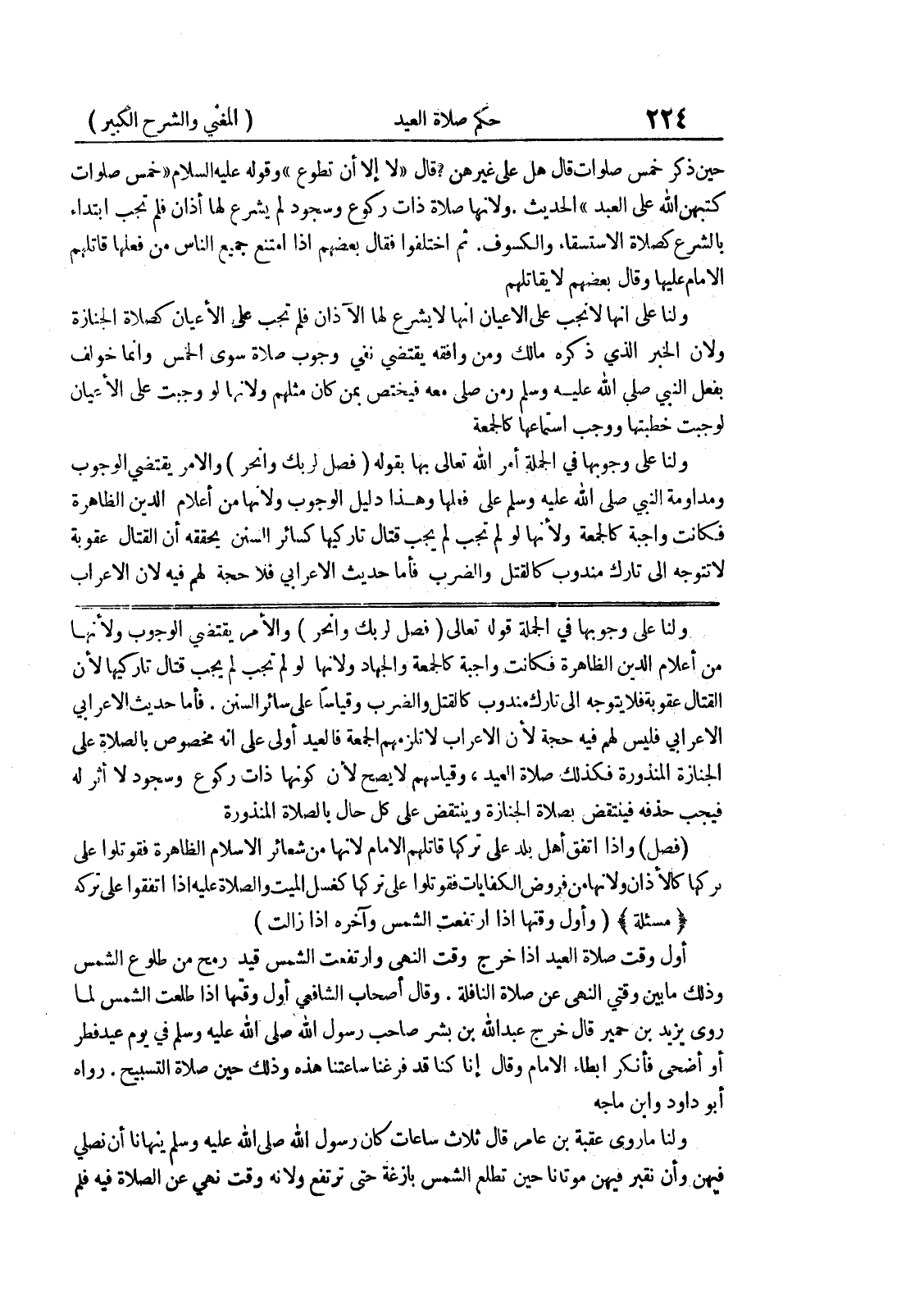فأما حديث الاعرابي الاعرابي فليس لهم فيه حجة لأن الاعراب لا تلزمهم الجمعة فالعيد أولى على أنه مخصوص بالصلاة على الجنازة المنذورة فكذلك صلاة العيد، وقياسهم لا يصح لأن كونها ذات ركوع وسجود أثر له فيجب حذفه فينتقض بصلاة الجنازة وينتقض على كل حال بالصلاة المنذورة (فصل) وإذا اتفق أهل بلد على تركها قاتلهم الامام لأنها من شعائر الإسلام الظاهرة فقوتلوا على تركها كالأذان ولأنها من فروض الكفايات فقوتلوا على تركها كغسل الميت والصلاة عليه إذا اتفقوا على تركه * (مسألة) * (وأول وقتها إذا ارتفعت الشمس وآخره إذا زالت) أول وقت صلاة العيد اذا خرج وقت النهي وارتفعت الشمس قيد رمح من طلوع الشمس وذلك ما بين وقتي النهي عن صلاة النافلة.